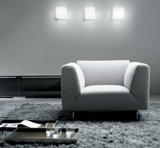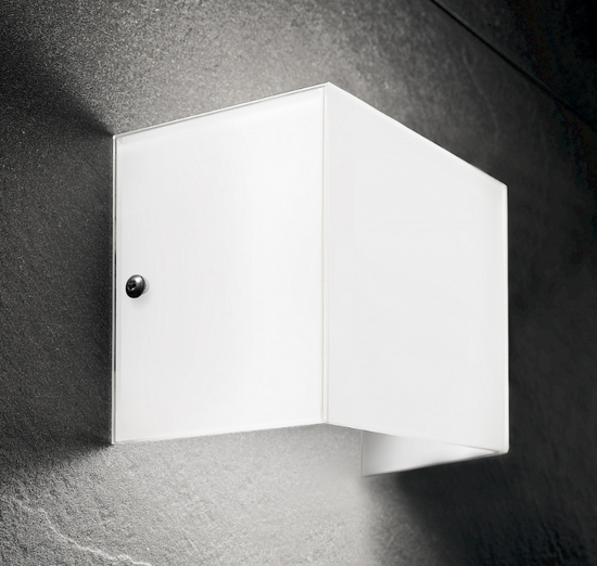 Aplica din sticla pe perete, cu colțuri lipite la 45° pentru a obține un efect luminos difuz. Sursa de alimentare integrata.