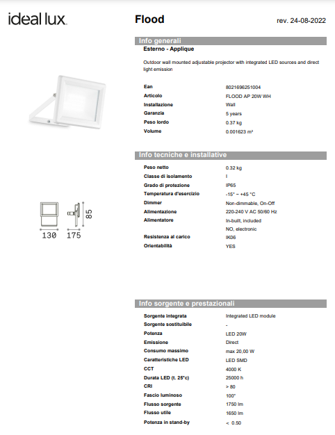 Corp de iluminat reglabil din aluminiu turnat sub presiune vopsit cu pulbere. Difuzor din sticlă securizată transparentă. Model cu senzor de mișcare cu lux și reglare a timpului de pornire. Disponibil în culorile alb sau negru.