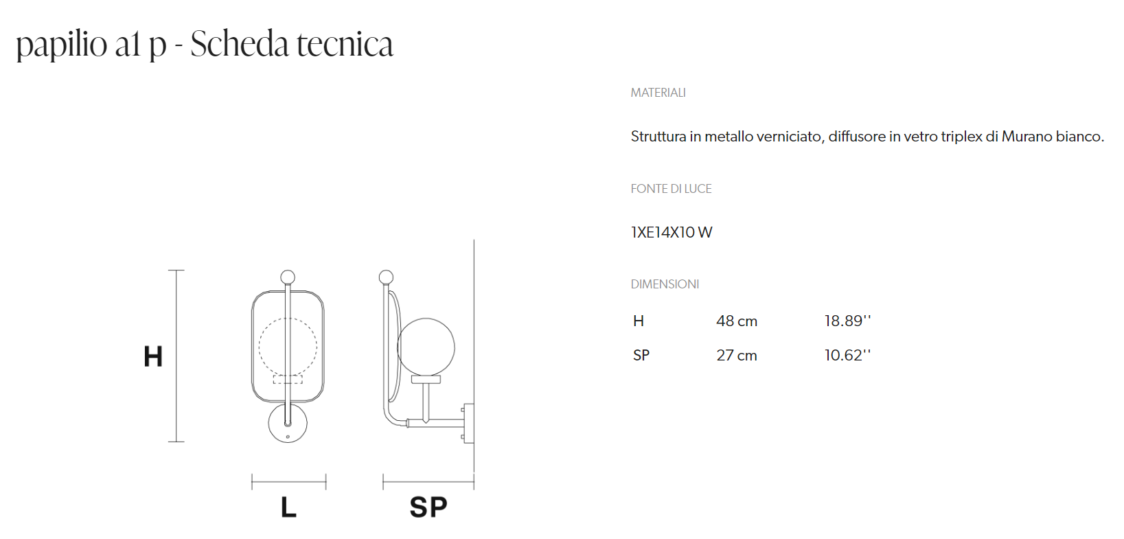 Papilio este o colecție inspirată dintr-o specie rară de fluture, Papilio machaon Linnaeus.  Structura din metal vopsit Difuzor din sticla triplex de Murano.