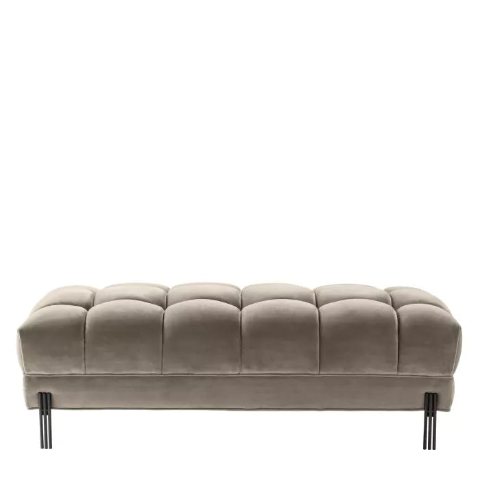 Somptuoasa bancă Sienna îmbină confortul cu stilul înalt. Acest scaun lung și elegant, modern, vine într-o tapițerie cu smocuri din catifea gri Savona. Picioarele finisate în negru adaugă un plus de glamour aspectului său luxos.