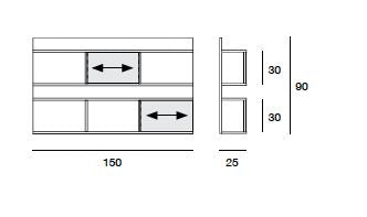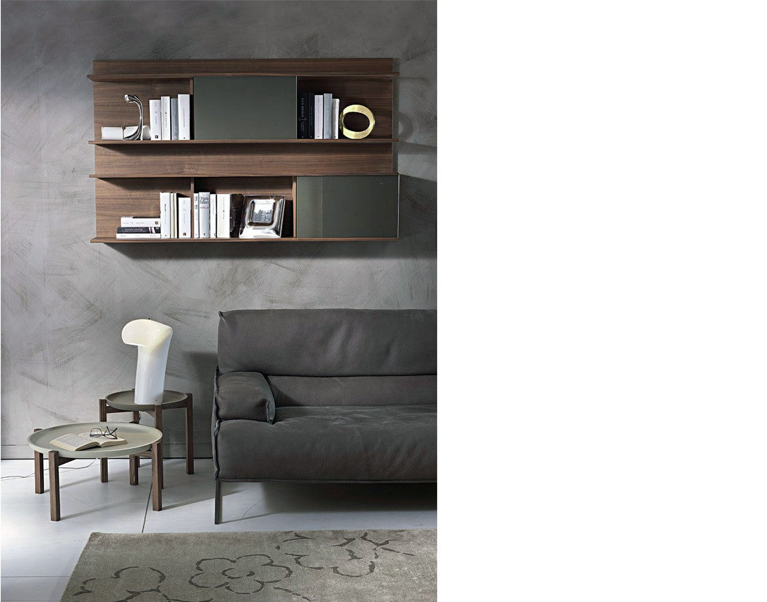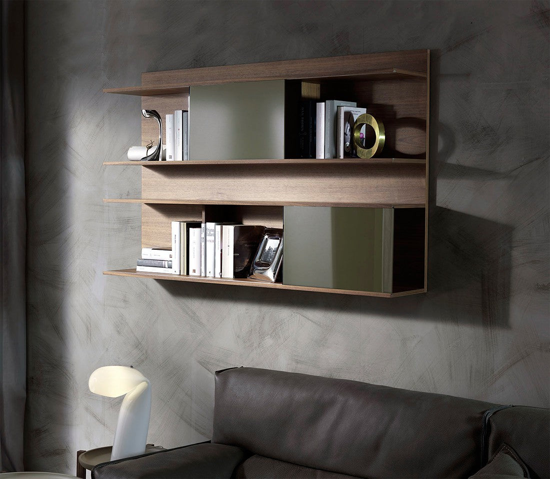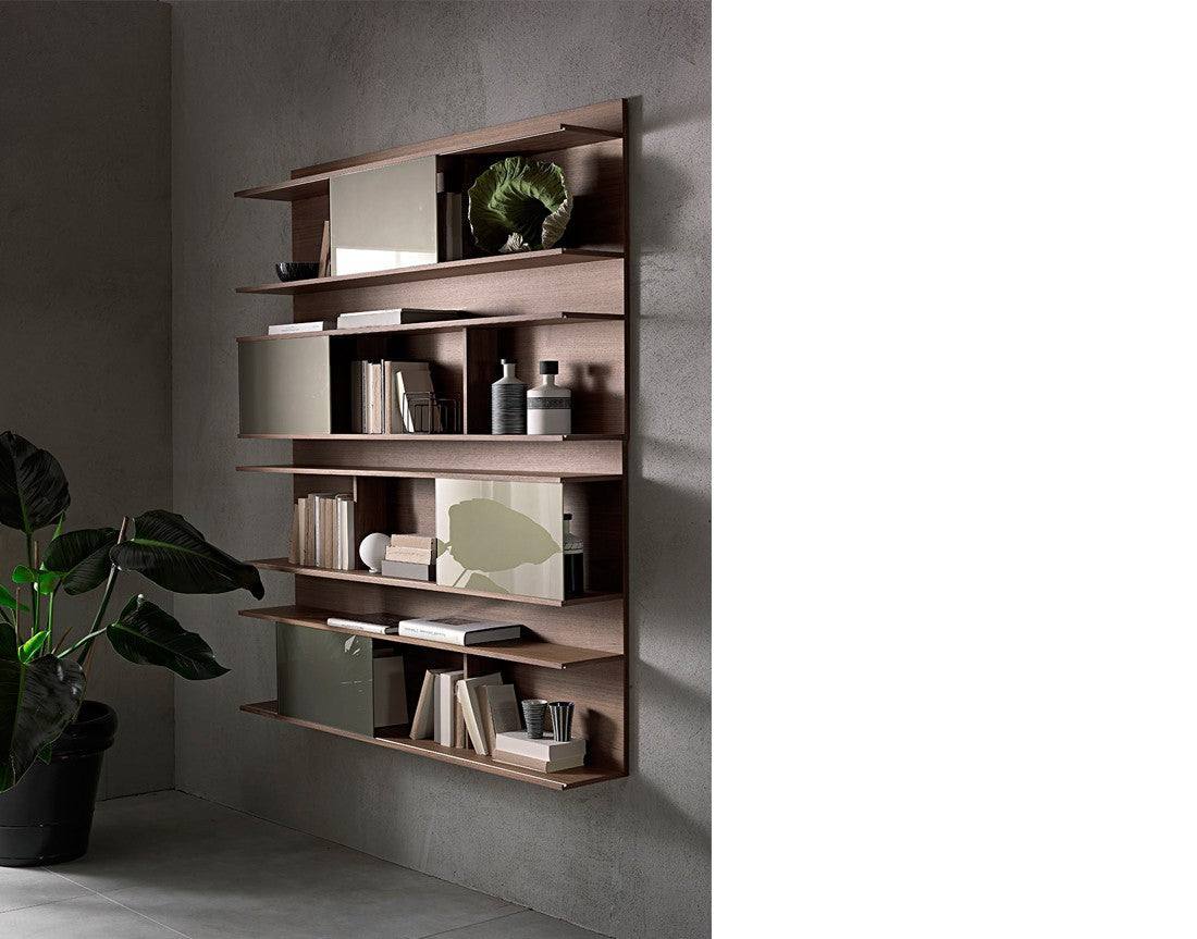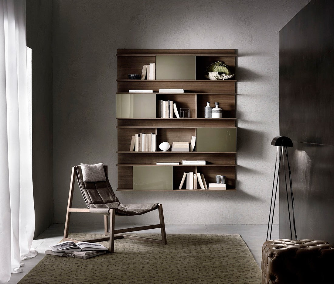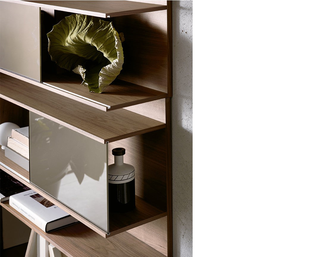 Bibliotecă de perete cu structură, rafturi și separatoare placate cu nuc canaletto. Uși glisante din sticlă vopsită (extra clar alb, negru, moka sau noroi).