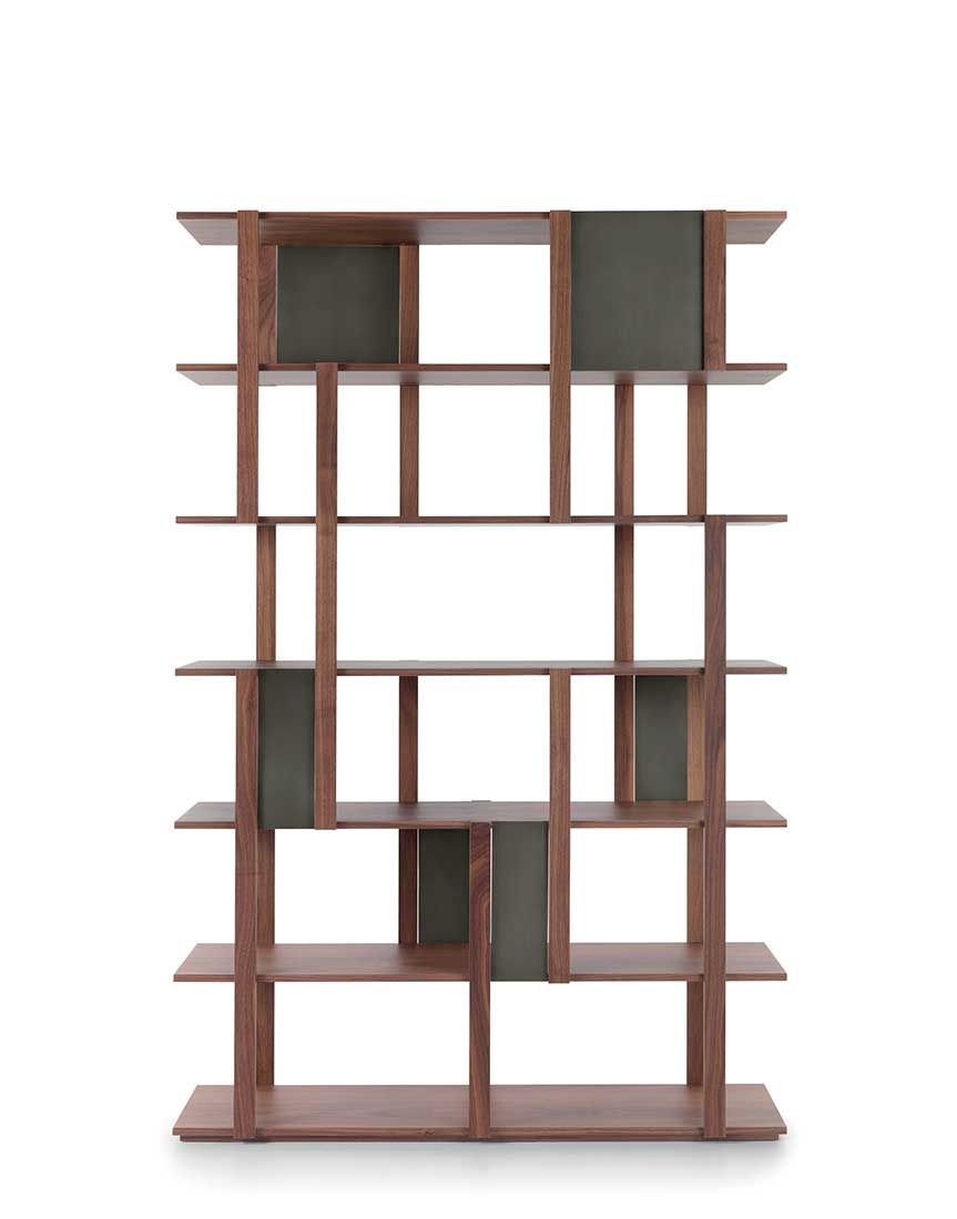 Bibliotecă de sine stătătoare și modulară cu structură și rafturi din nuc canaletto. La cerere, inserții din metal vopsit titan, bronz sau alamă patinata.