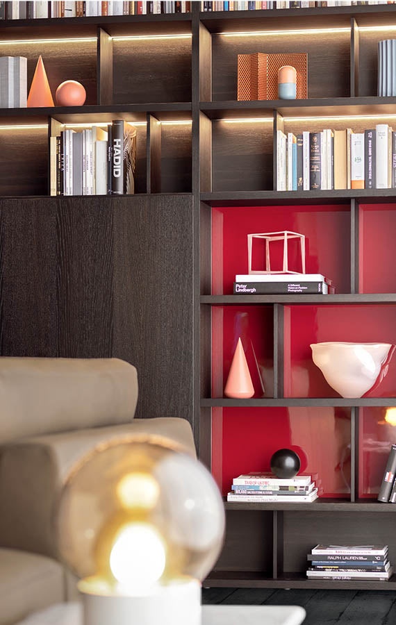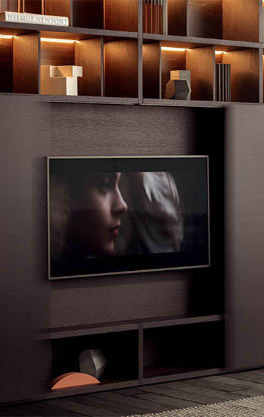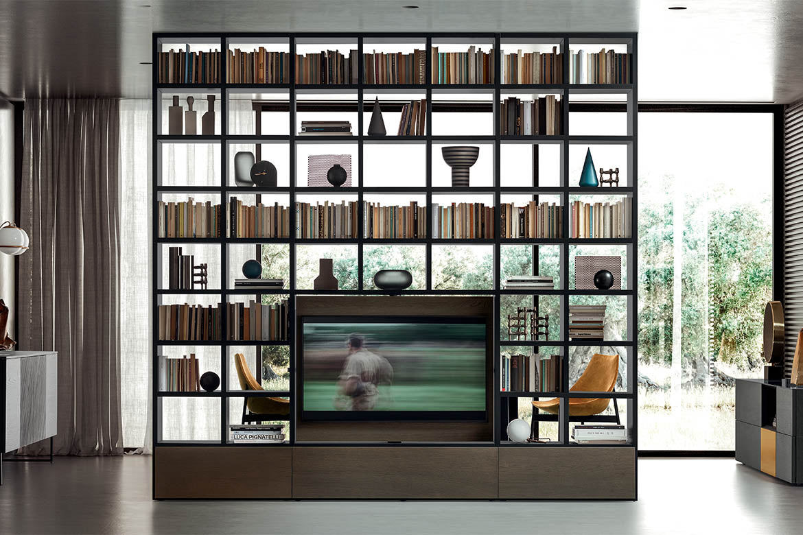 Amenajarea unui spațiu personalizat, crearea de combinații distinctive și echilibrarea spațiilor deschise și închise: Spazioteca este sinergia ordinii, ritmului și proporției. Conceptul clasic de bibliotecă se deschide spre noi posibilități versatile, oferind un loc pentru depozitarea obiectelor, cărților și ecranului televizorului, împărțind zonele din locuință și integrând soluții de birou la domiciliu. Este primul sistem modular cu panouri laterale, rafturi, panouri din spate și despărțitori cu un pas de 1 cm ca standard și compartimente fără găuri sau feronerie vizibile. Fiecare compoziție are același design dinamic, ușor, făcut la comandă pentru a satisface orice nevoie.