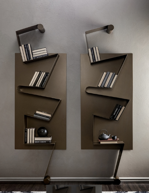 O bibliotecă de perete din metal inspirată dintr-o notă muzicală. Practic și conceput pentru a oferi cărților tale o mișcare adecvată.