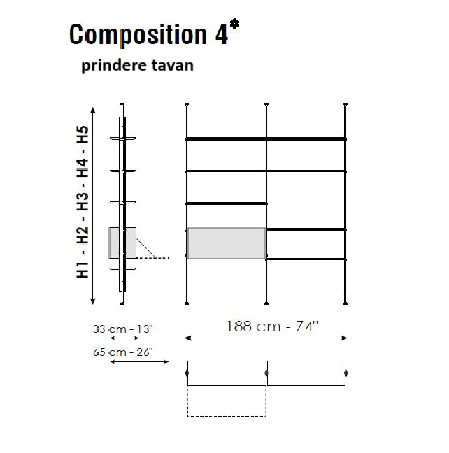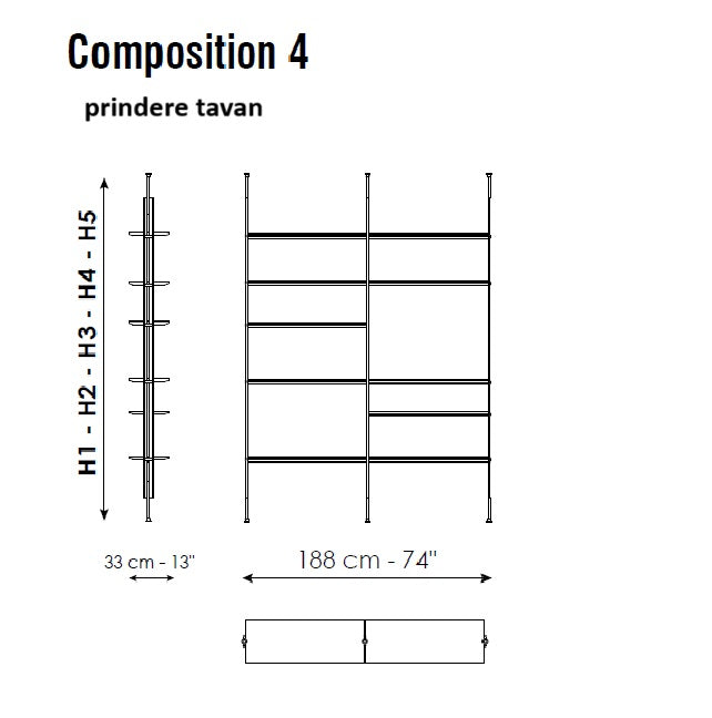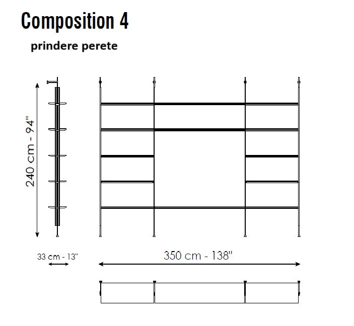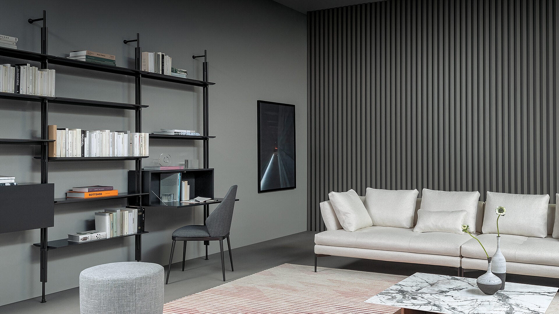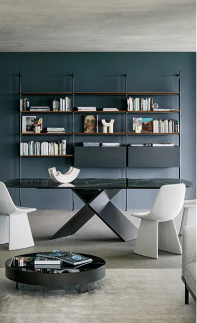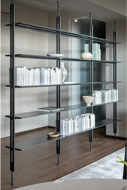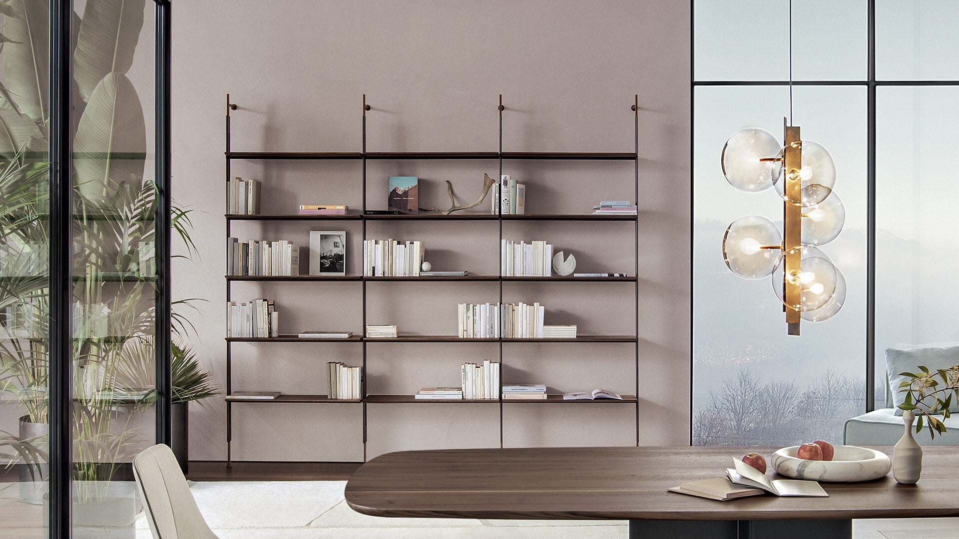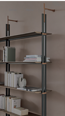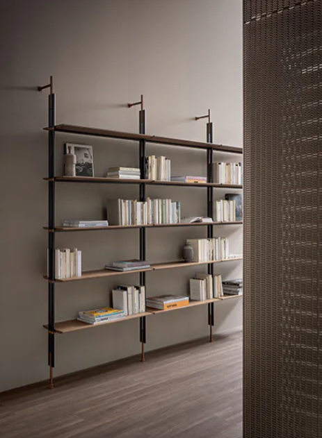Posibilitatea de a fixa biblioteca modulară modernă Roll atât pe tavan, cât și pe perete, o transformă într-un element de mobilier care poate fi instalat și în centrul unei camere pentru a o împărți în două spații. Montarea pe perete se face prin intermediul unor suporturi compuse din tuburi metalice cu finisaj plumb; atât rafturile, cât și detaliile care ies din tuburile metalice sunt disponibile în același finisaj ca și suporturile sau în finisaje diferite pentru un joc de contraste de o eleganță maximă. Modularitatea bibliotecii moderne Roll o face potrivită pentru orice dimensiune de perete, atât acasă, cât și la birou. Este disponibil și un modul tip cutie, pentru depozitarea obiectelor și a cărților.