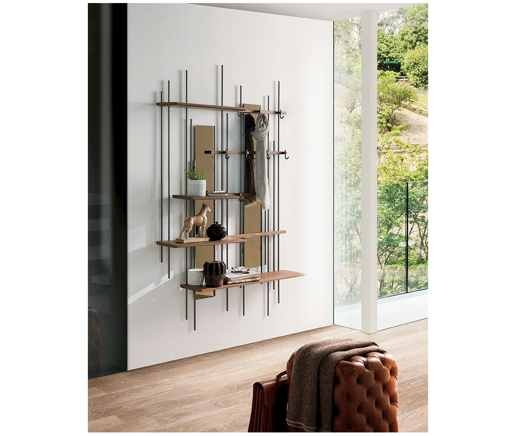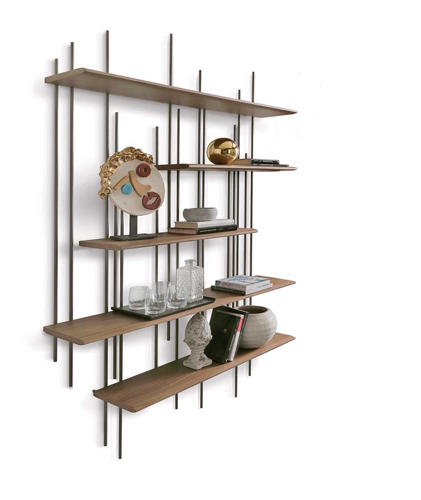 Bibliotecă cu structură din metal vopsit titan. Rafturi furniruite din nuc canaletto sau frasin.
