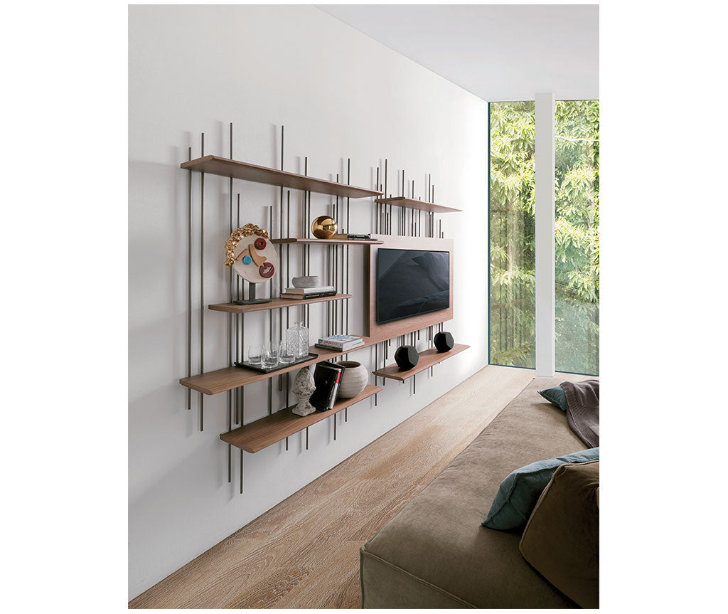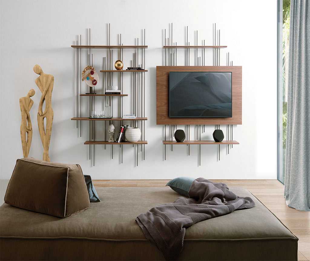Tube este o bibliotecă esențială, flancată de modulul suport TV, este perfectă pentru realizarea pereților dotați modern.