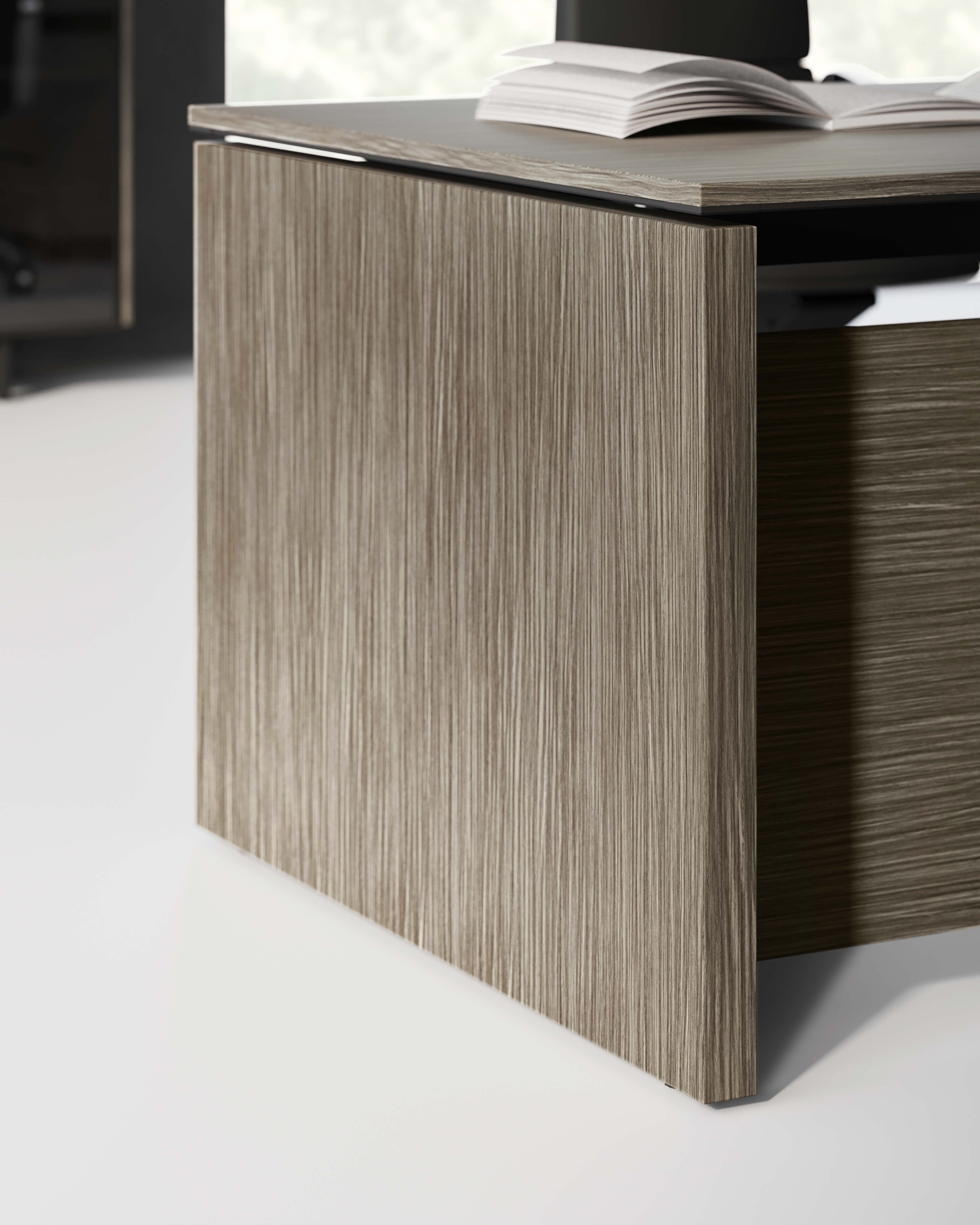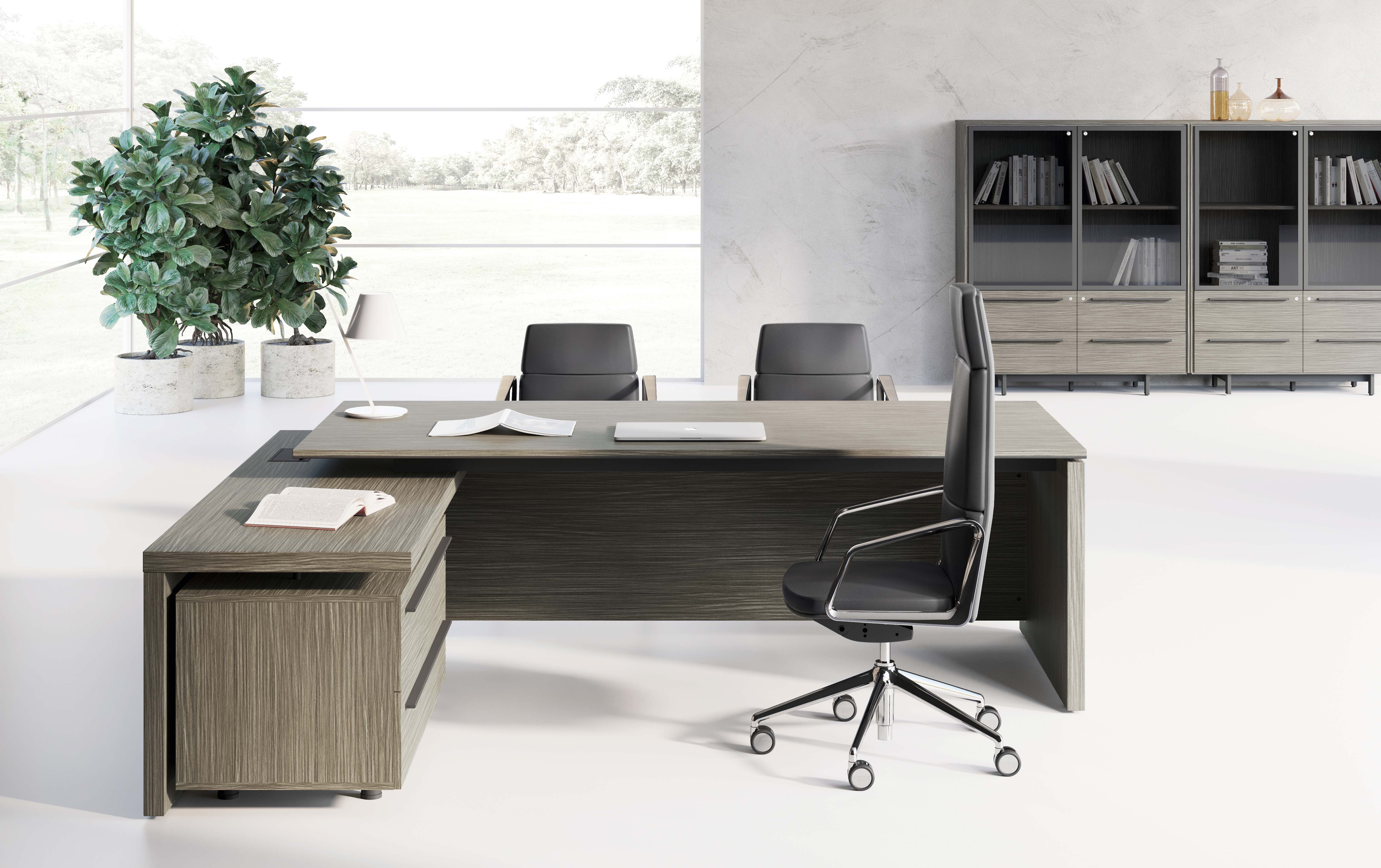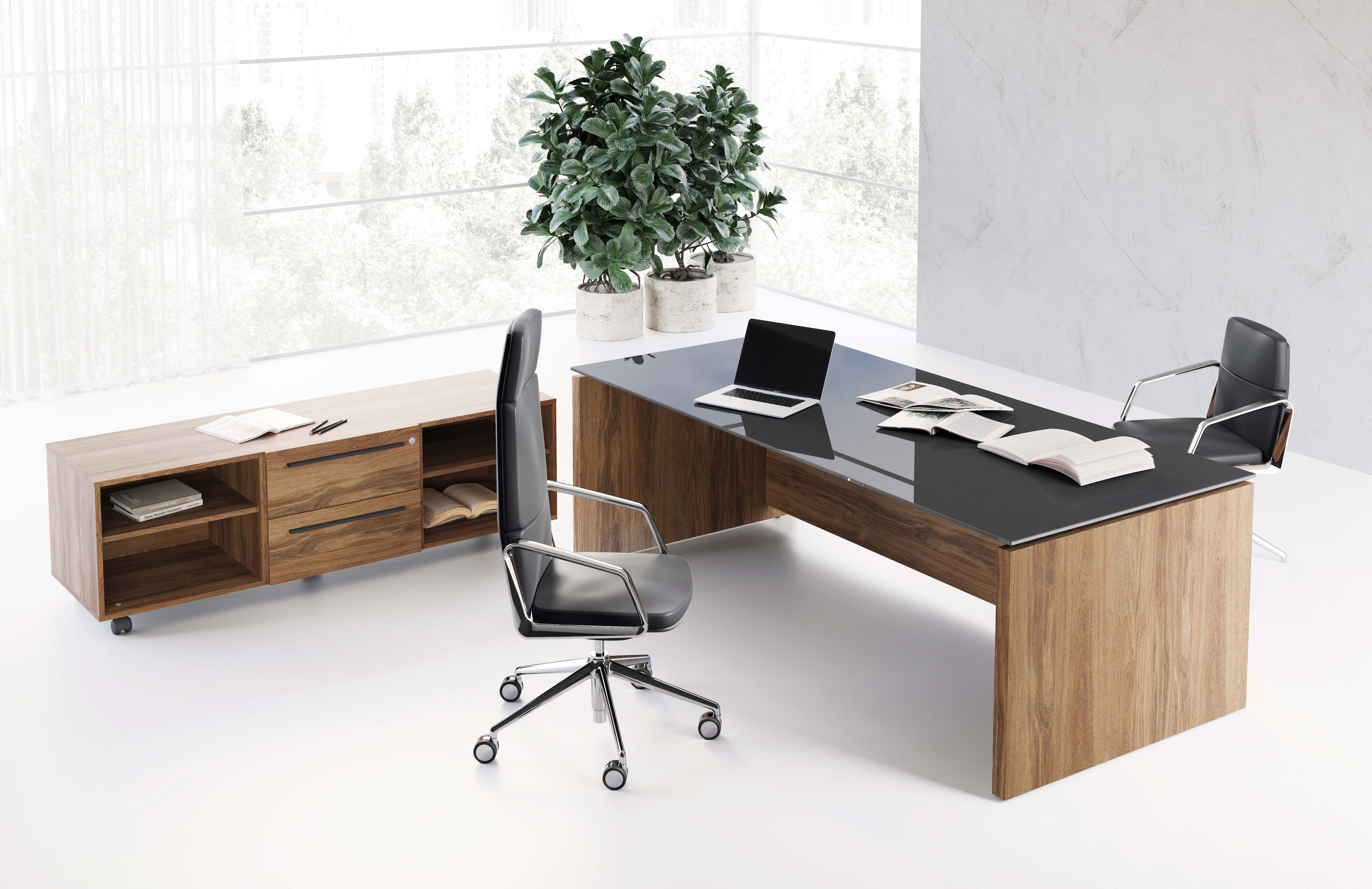 Un birou executiv cu impact vizual puternic, conceput pentru directori dinamici și orientați spre eficiență. Aici, suprafețele mari din lemn sunt evidențiate de o margine ușoară a blatului de aluminiu negru care conturează suprafața pe structură sau sticla .