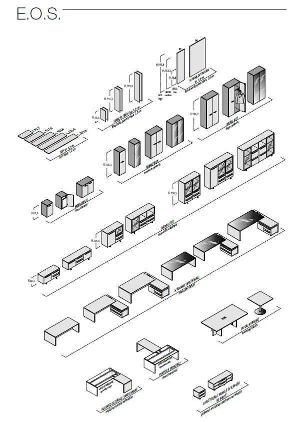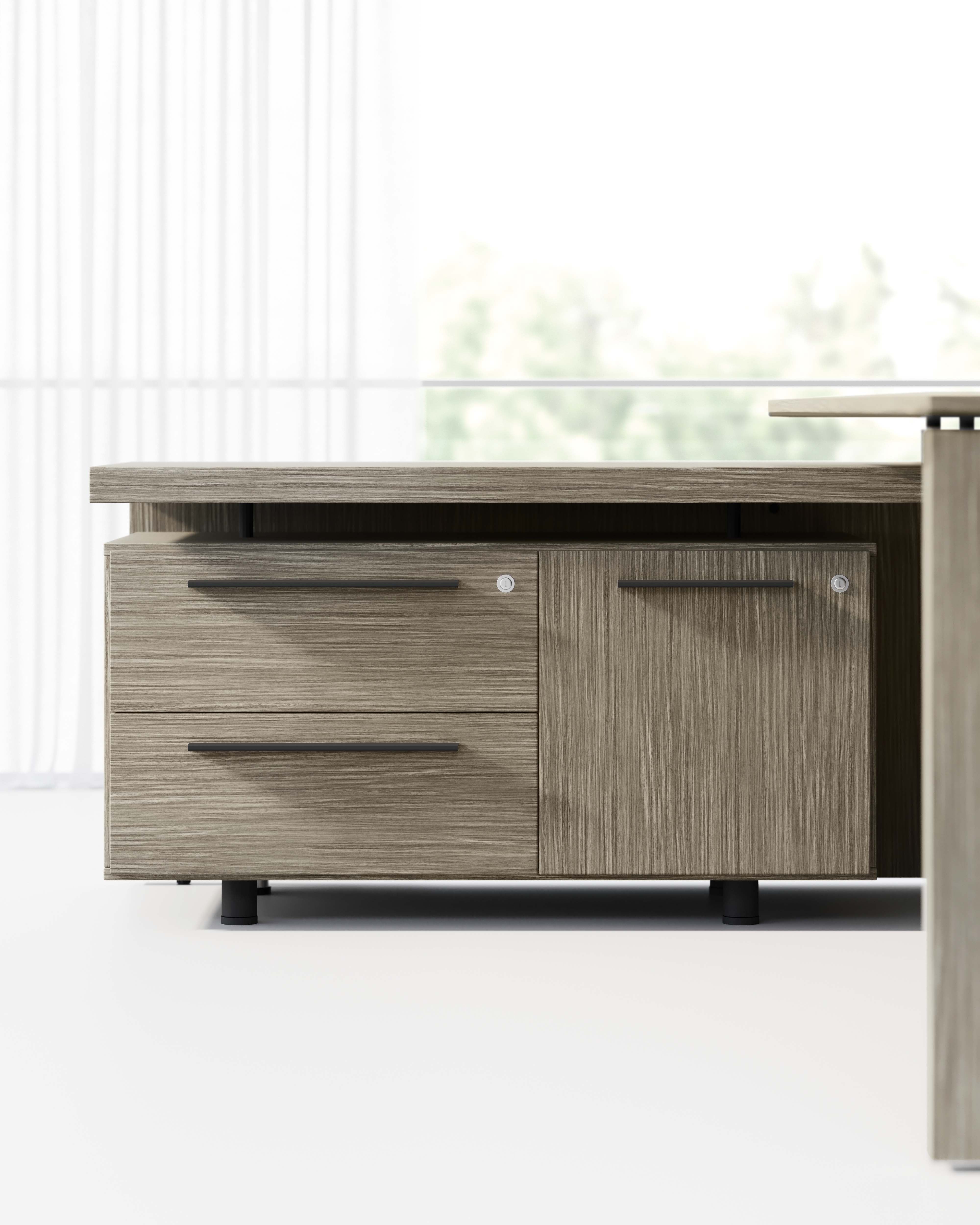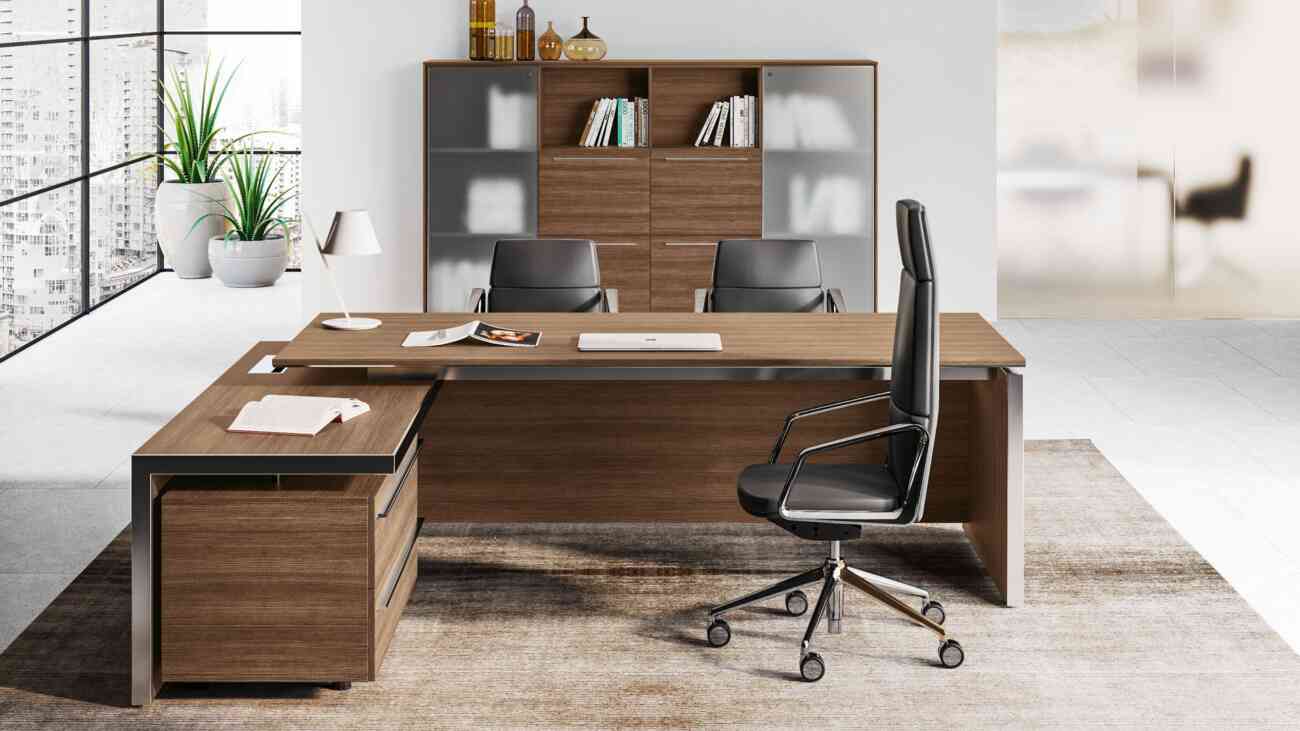 Un birou executiv cu impact vizual puternic, conceput pentru directori dinamici și orientați spre eficiență. Aici, suprafețele mari din lemn sunt evidențiate de o margine ușoară a blatului de aluminiu negru care conturează suprafața pe structură sau sticla .