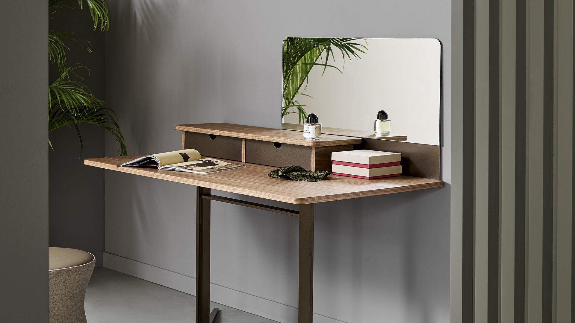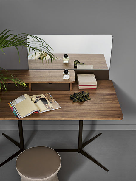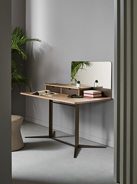 Liniile curate și o senzație contemporană caracterizează această piesă din colecția Nelson de Matteo Nunziati, care poate fi aleasă în versiunea sa pentru machiaj sau birou acasă. Inspirat de modernism - o perioadă care vizează reînnoirea personajului, design și principii de arhitectură - se prezintă meticulos detalii care pun în valoare suprafețele. Blatul din nuc Canaletto este susținut de o bază metalică cu un aspect minimalist, dar contemporan