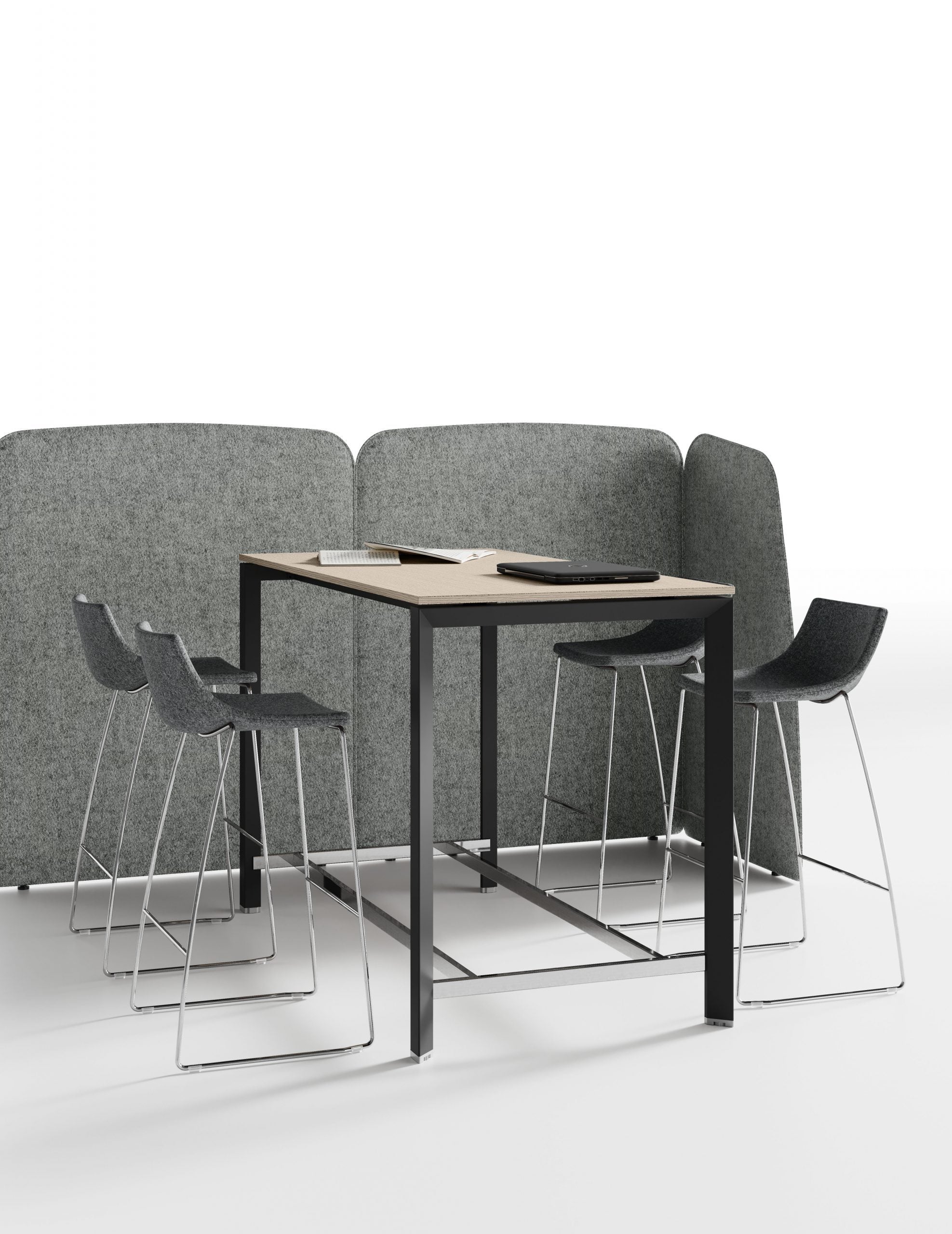 Stații de lucru operaționale cu layout comun, gata să primească accesorii și ideale pentru a răspunde nevoilor de spațiu de lucru modern și performant. Panourile frontale din fetru imprimat contureaza zonele de lucru si creeaza un confort acustic optim, local si in intregul mediu.