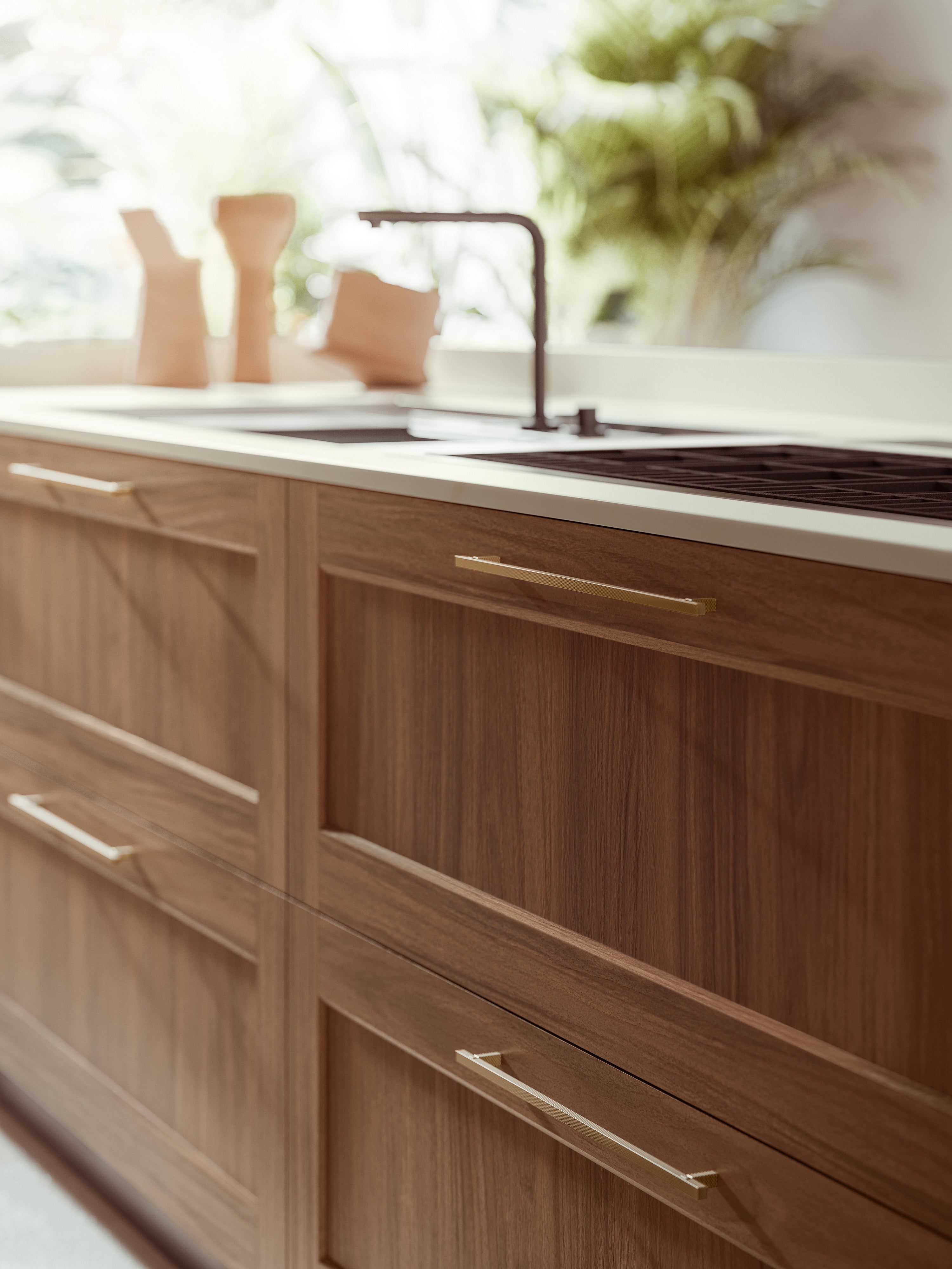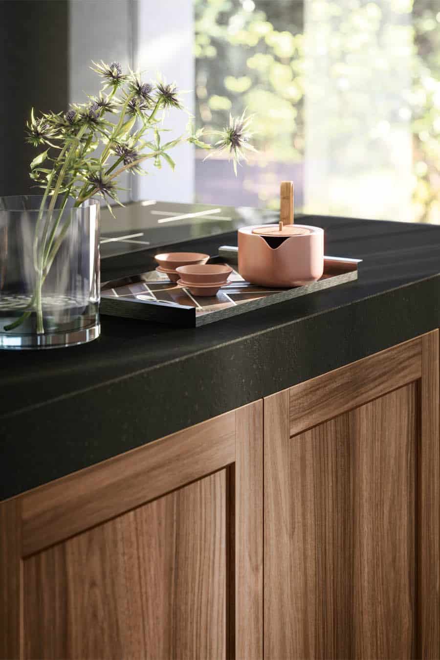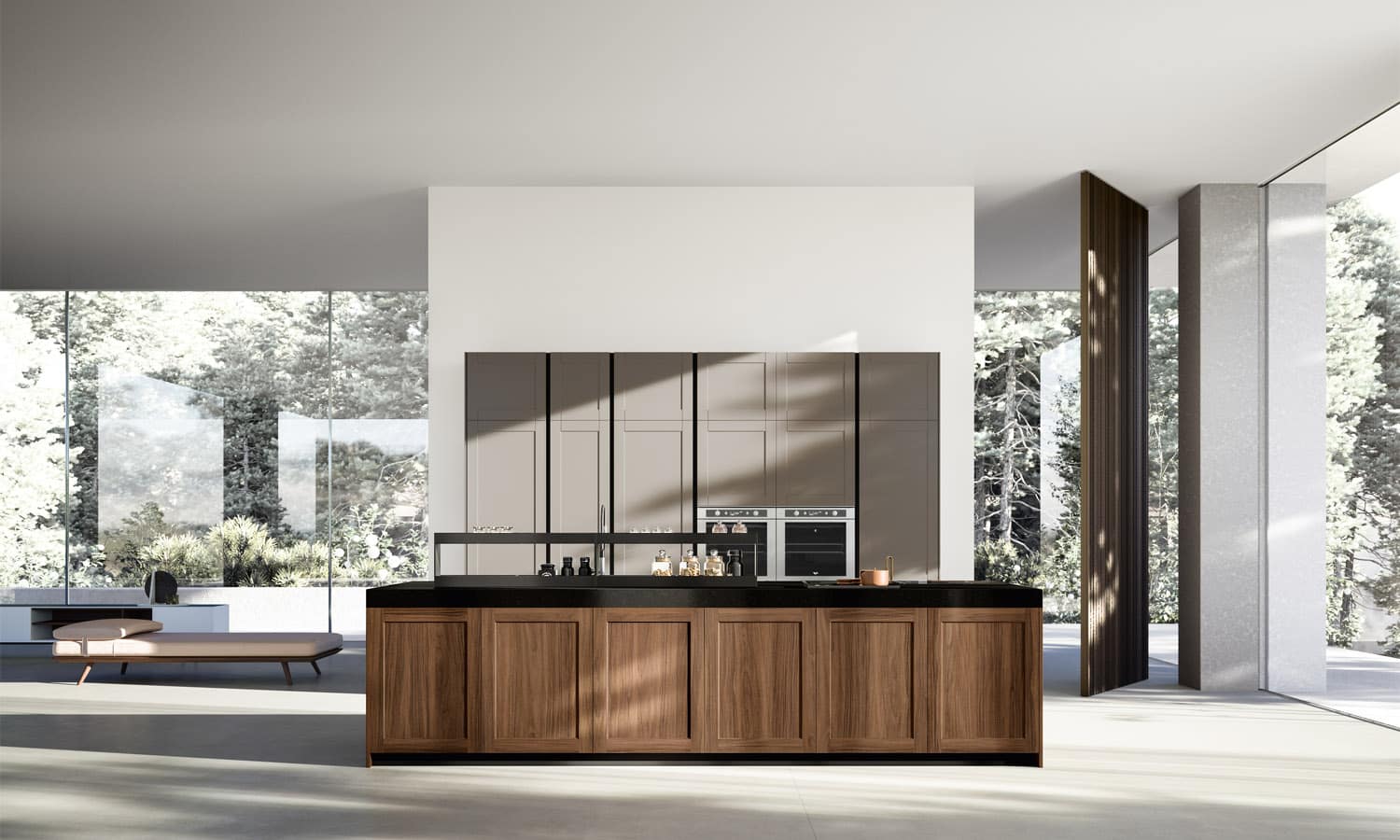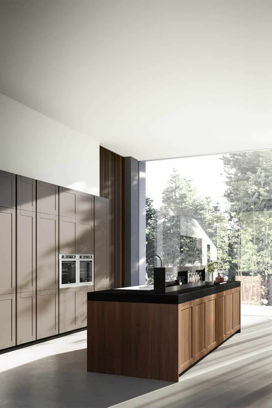 Această bucătărie evocă amintiri și idei, reprezentate de ușa cu rame din lemn masiv Noce de pe insulă și MDF Metro laccato opaco pe blocurile înalte. Designul precis, esențial, este subliniat de sistem de deschidere push-pull de pe uși și de blatul de lucru Silestone foarte gros.