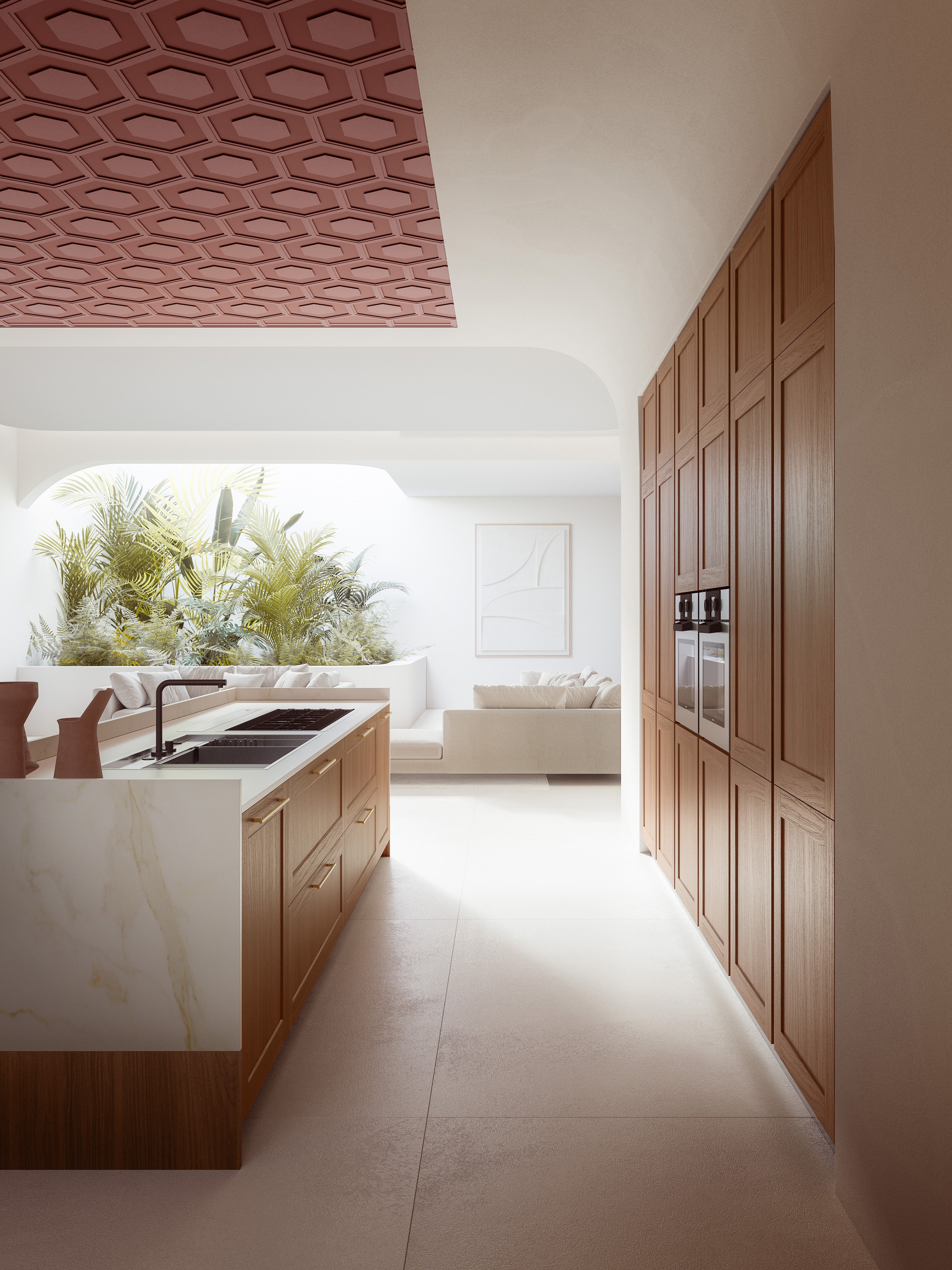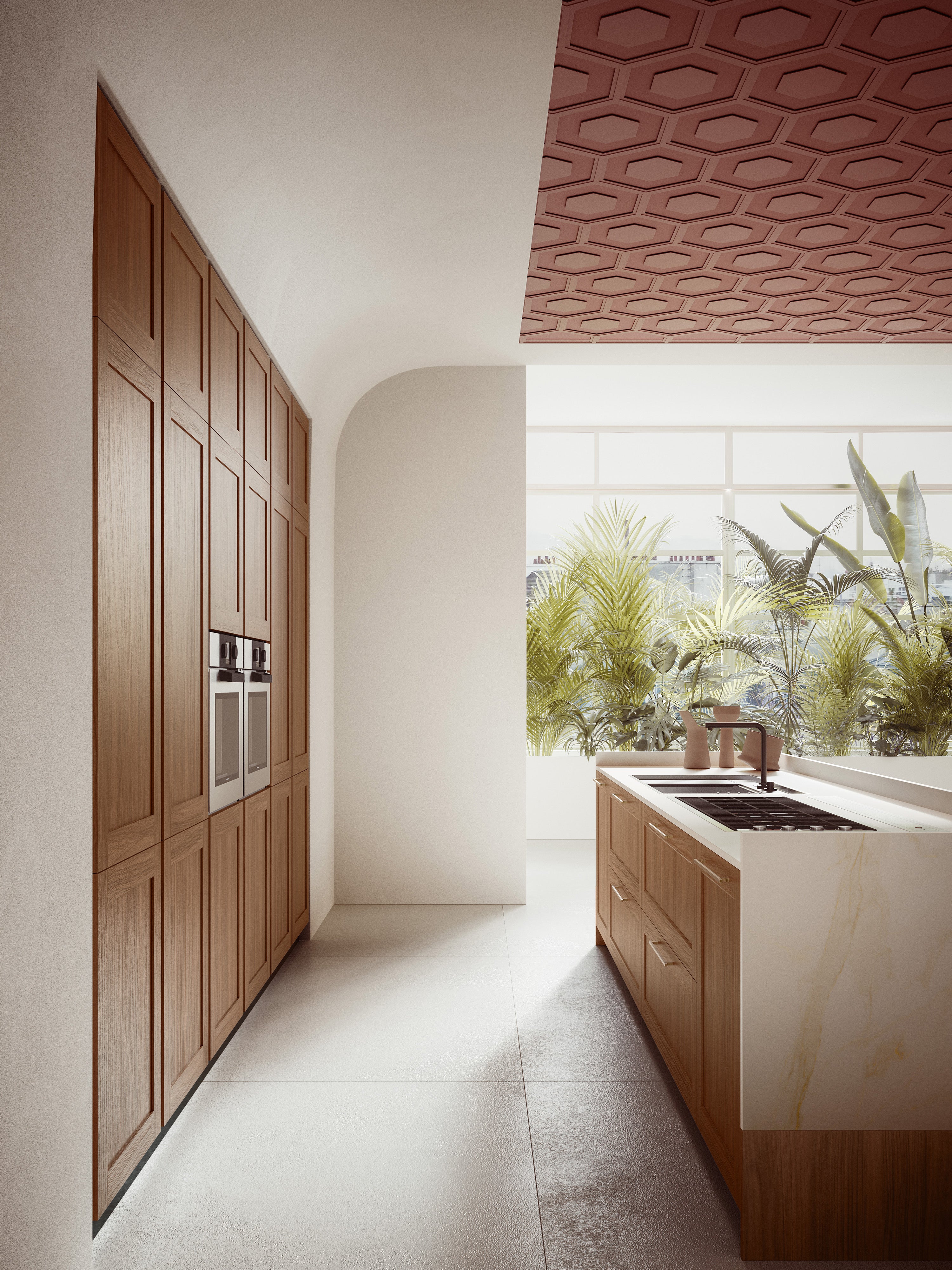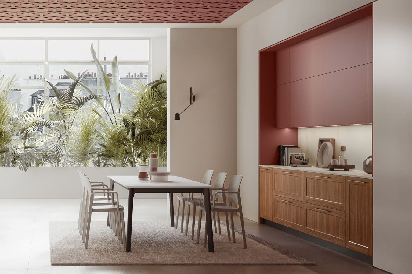 O ambianță modernă cu accente clasice exaltate de formele rotunjite care încadrează bucătăria cu ușă încadrată Ligna din lemn masiv de nuc cu mânere Gold. Zona de zi combină melamina Cachemire cu Rosso Terra, repetate în detaliile arhitecturale ale tavanului.