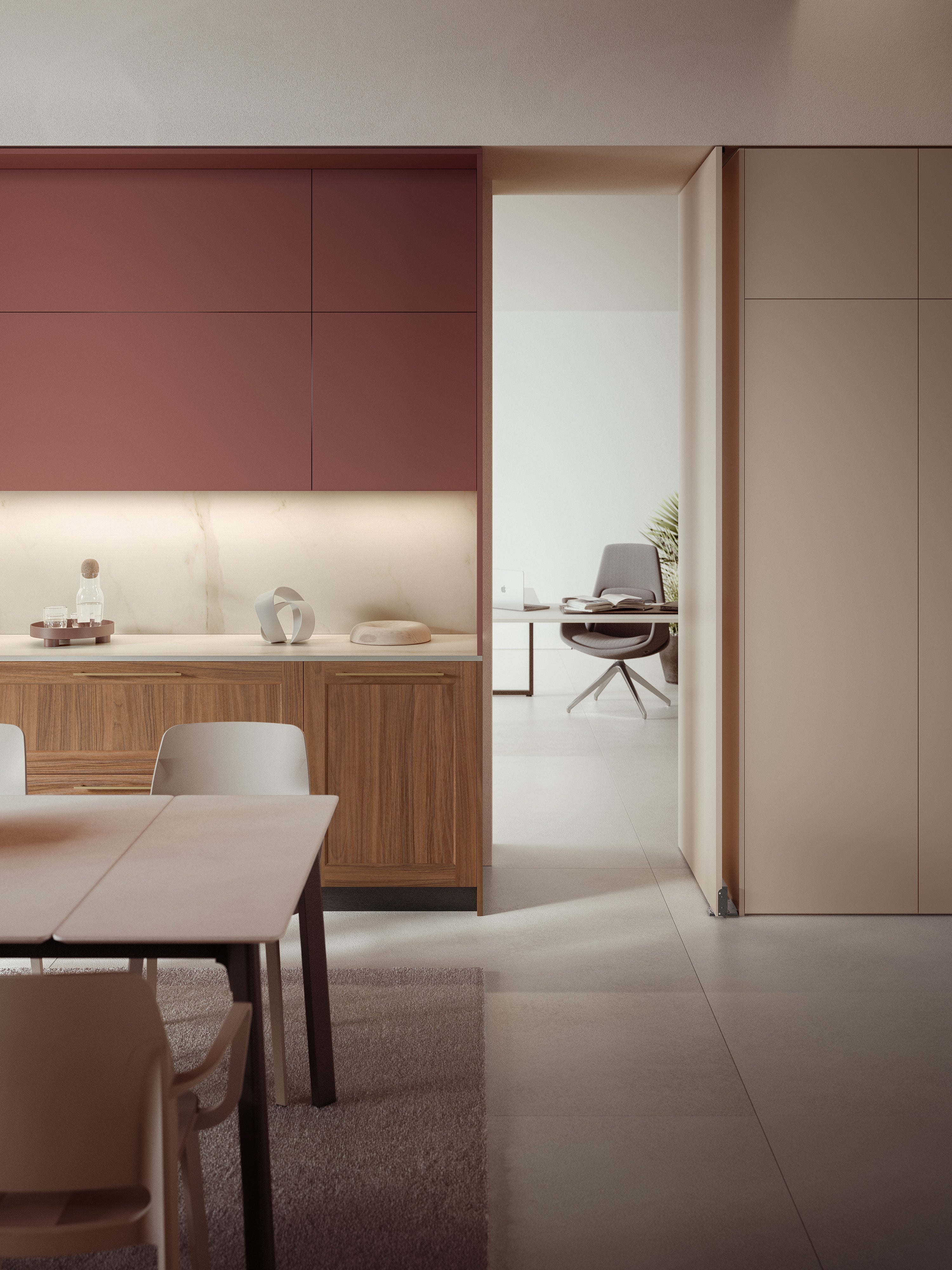 Ușa pivotantă integrată în unitățile înalte ascunde o trecere către alte zone. Simbioză perfectă între funcționalitate și design esențial, vine ca o versiune care se atașează la o unitate înaltă laterală sau la o unitate înaltă și un compartiment superior.