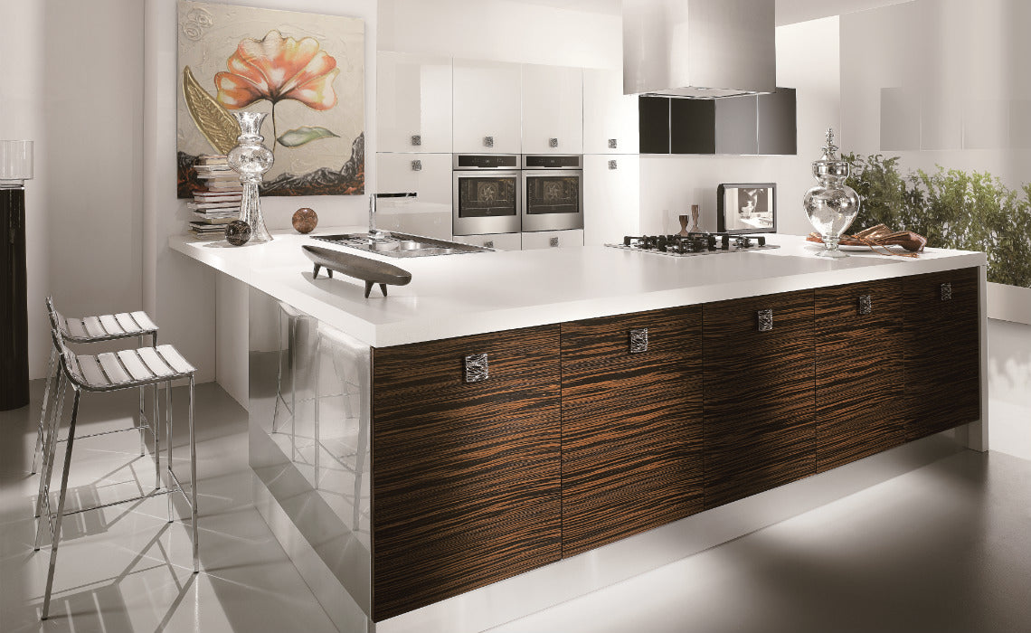 Proiectul Systema al lui Cucinesse se caracterizează prin furnir tăiat de stejar, în multiple finisaje.