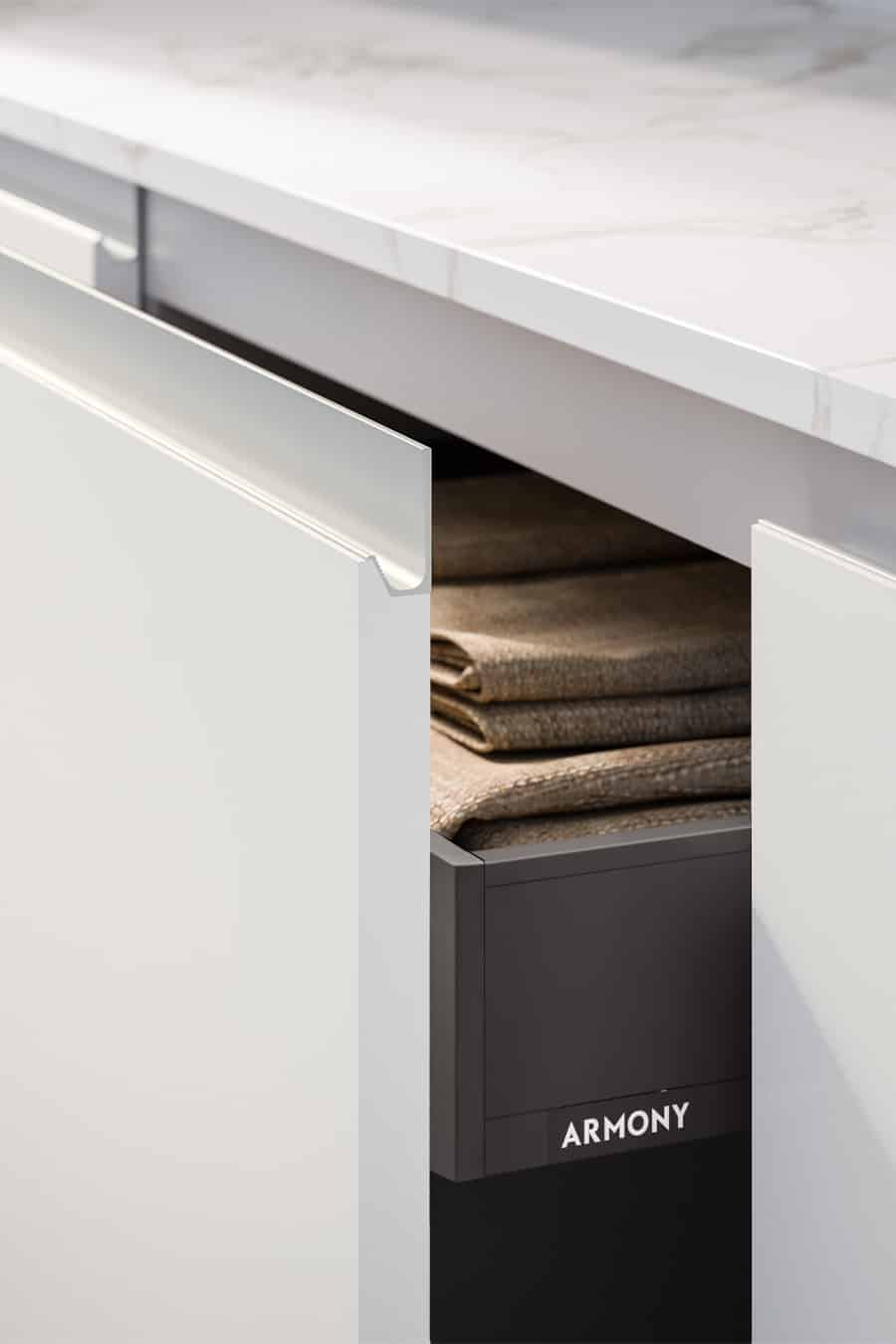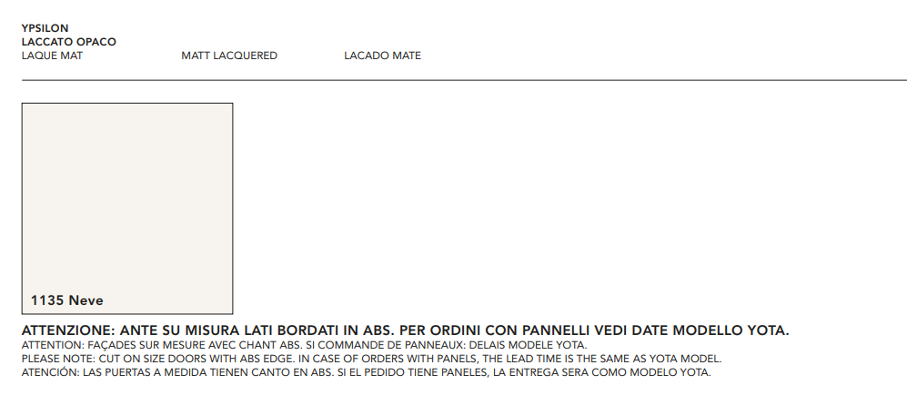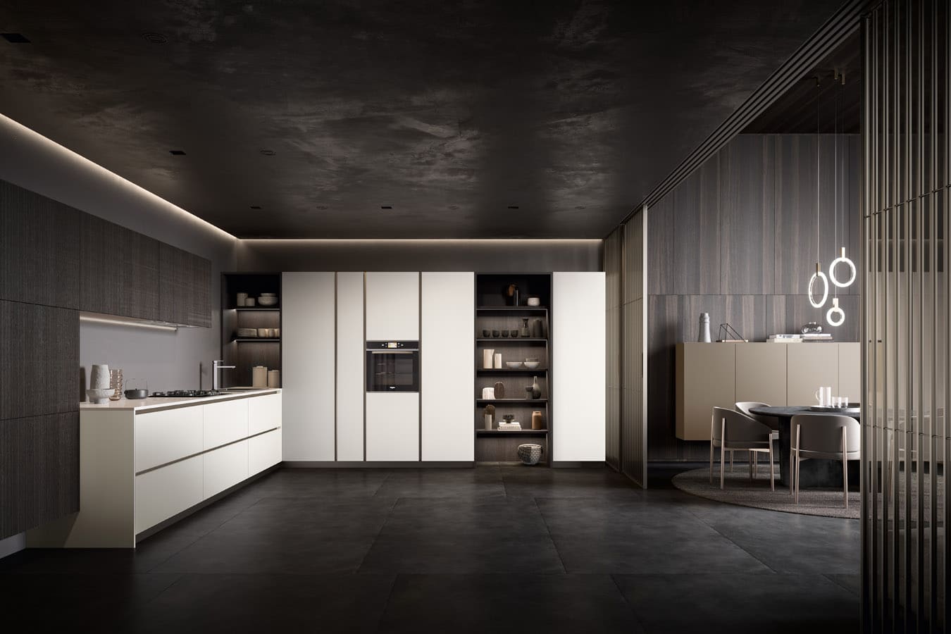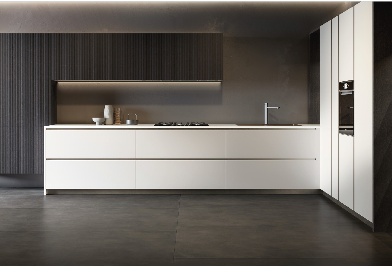 Contrastele rafinate, elegante disting această compoziție în finisaj lăcuit mat Neve și furnir din lemn Station. Neaglomerată și contemporană, bucătăria este îmbunătățită de profilele de prindere în finisajul Titanio și de unități de perete cu uși emblematice de dulap Riga cu suprafață nervură. Acest efect 3D asupra lemnului creează reflexii minunate și conferă distincție bucătăriei.