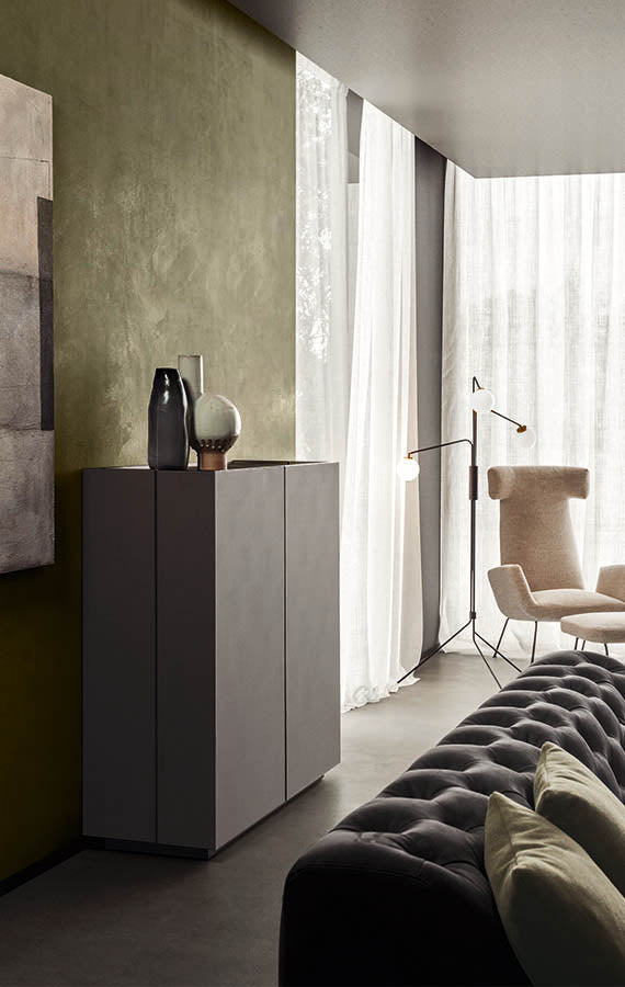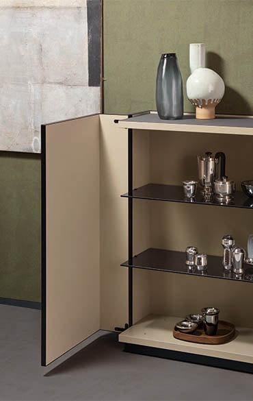 Elegant și sofisticat, bufetul Cornice își împrumută numele de la garderoba omonimă din colecția Pianca, reducând caracteristicile sale principale pentru a se potrivi noului său scop. Elementul care dă caracterul unității este cadrul care se întinde pe marginile tuturor panourilor, punctând structura și atrăgând atenția asupra rulării modulelor. La fel de elegantă, dar puțin mai excentrică, este deschiderea ușilor în stil capac cu balamale de la fiecare capăt, o caracteristică întâlnită și în noua colecție de dulapuri Pianca. Acest detaliu de design va face din Cornice și mai mult o piesă de declarație, permițându-i să-și împlinească destinul și să ocupe centrul atenției în cameră, mai degrabă decât să se limiteze doar la forma sa închisă. O opțiune atractivă este acoperirea ușilor și a blatului în piele sintetică.