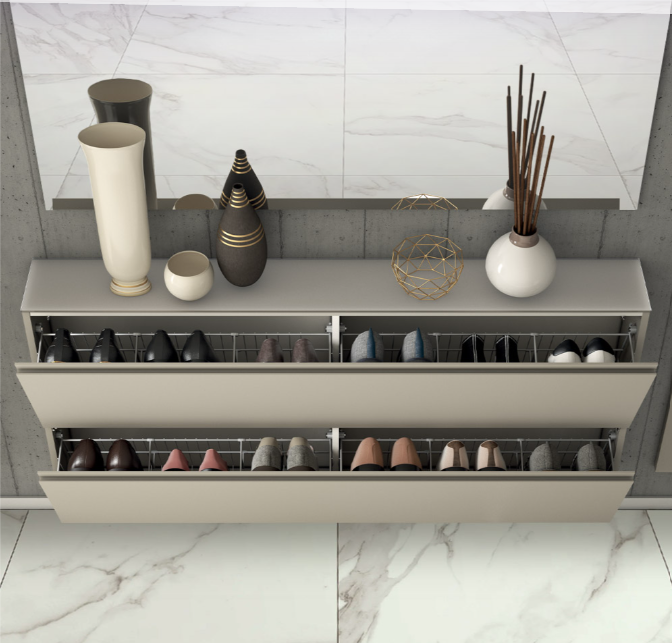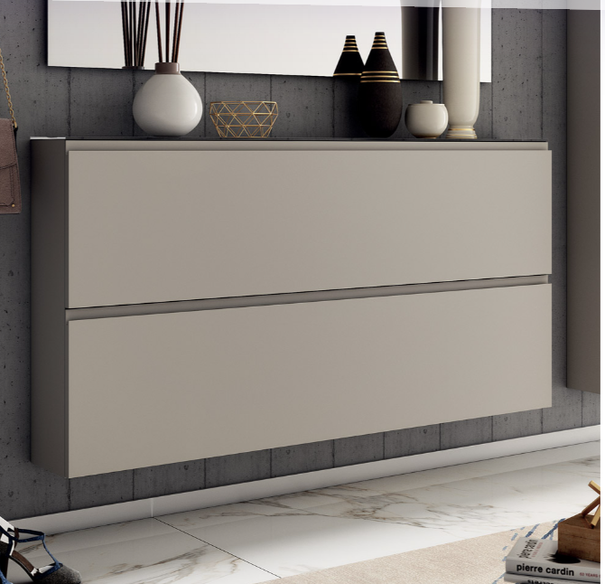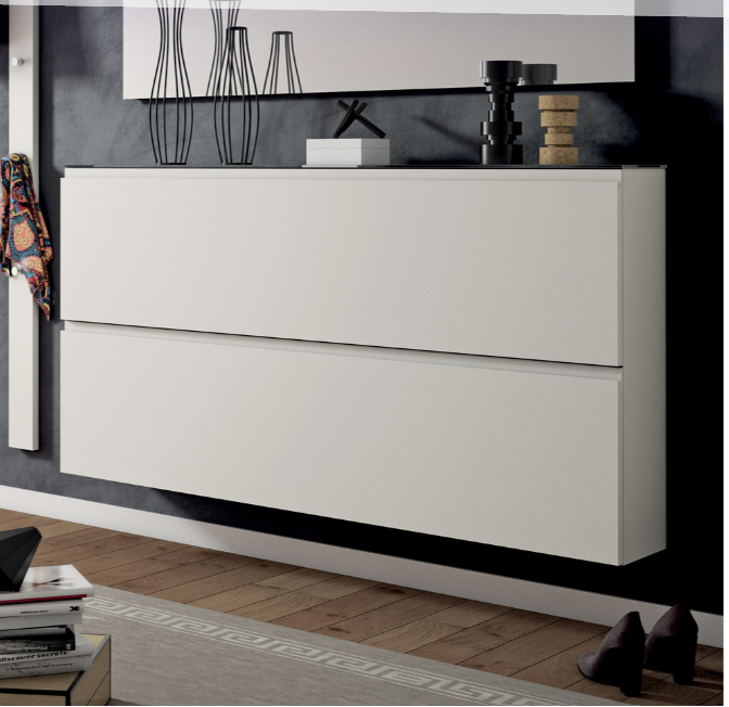 Dulap pentru pantofi Dolce Vita, mobilier suspendat cu blat de sticla pe care nu raman amprentele si structura din pal vopsit.