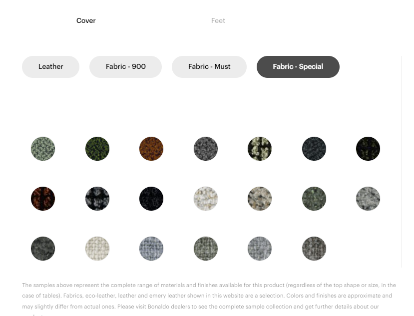 Materialele, țesăturile, pielea, culorile și finisajele sunt aproximative și pot diferi ușor de cele reale. Colecția completă de țesături și piei Bonaldo o găsiți pe site-ul www.bonaldo.com