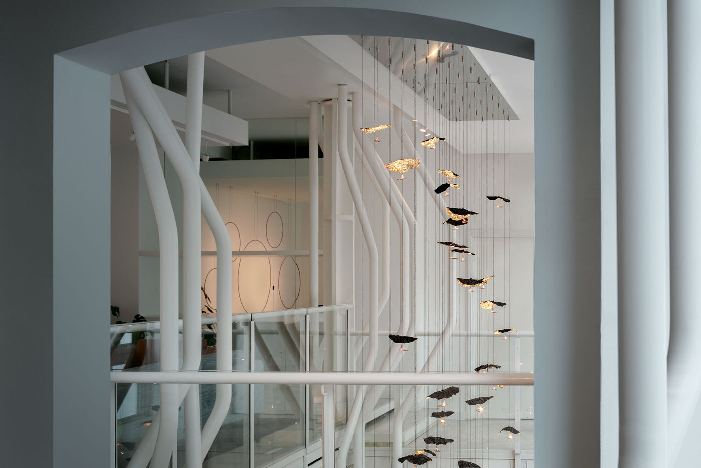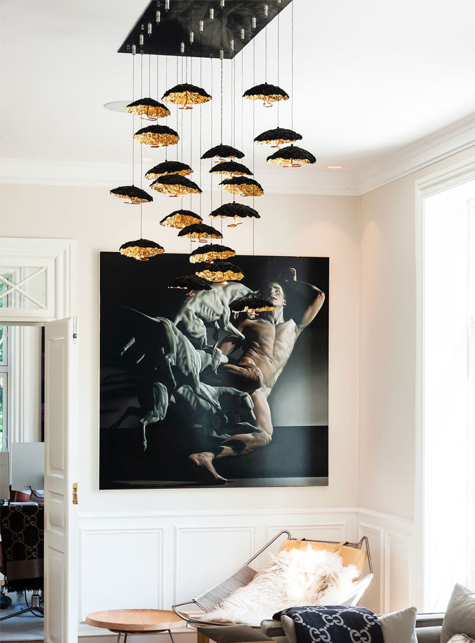 Gold Moon Chandelier aduce o nouă întorsătură distinctivă conceptului tradițional de candelabru, transformându-l într-o cascadă izbitoare de lumină suspendată. Poate fi creat într-o varietate de modele, cu diferite baze, finisaje și număr de elemente, și este compus dintr-o serie de discuri cu forme neregulate, suspendate de care sunt suspendate cabluri subțiri de diferite înălțimi care se termină în bucle frumoase de cupru legănând mici lumini LED. . Suprafața internă a discurilor, acoperită manual cu foiță de aur, se angajează cu lumina emisă de LED-uri, amplificând-o și creând o ambianță atrăgătoare.