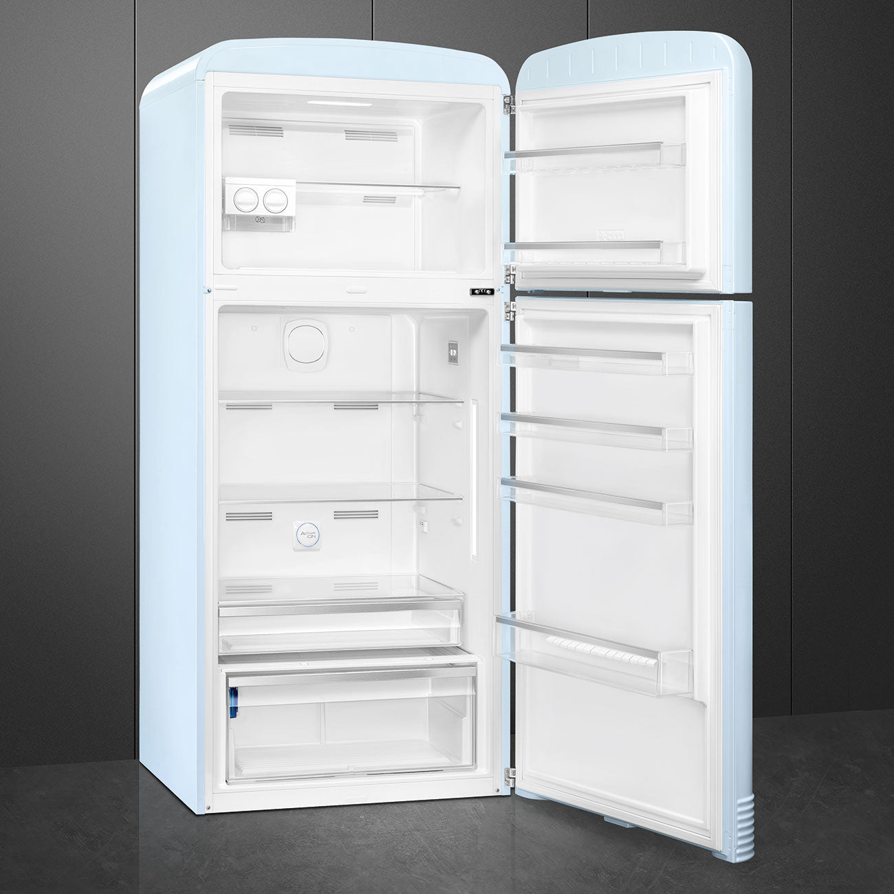 Ventilat: Distribuția forțată a aerului rece în compartimentul frigider, care permite o distribuție uniformă a temperaturii în frigider. Sistemul Smeg Active Ion îmbunătățește calitatea aerului din interiorul celulei. Datorită generării de ioni încărcați negativ eliberați în interiorul frigiderului, sistemul Active Ion neutralizează praful neplăcut. Aer plus: păstrează alimentele proaspete mai mult timp.