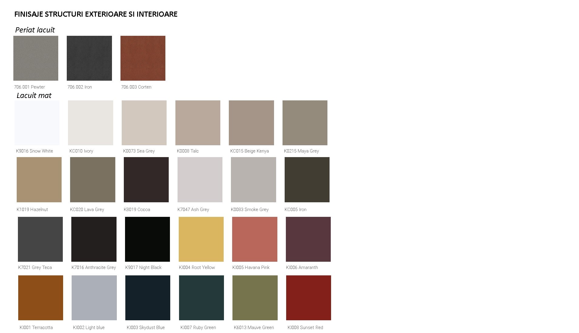 In prezentarea produsului sunt specificate cateva cotatii de pret aferente celor trei tipuri de design pentru finisajele cel mai frecvent intalnite. In galeria photo exista toate tipurile de finisaje si se poate solicita o cotatie de pret telefonic sau pe mail.