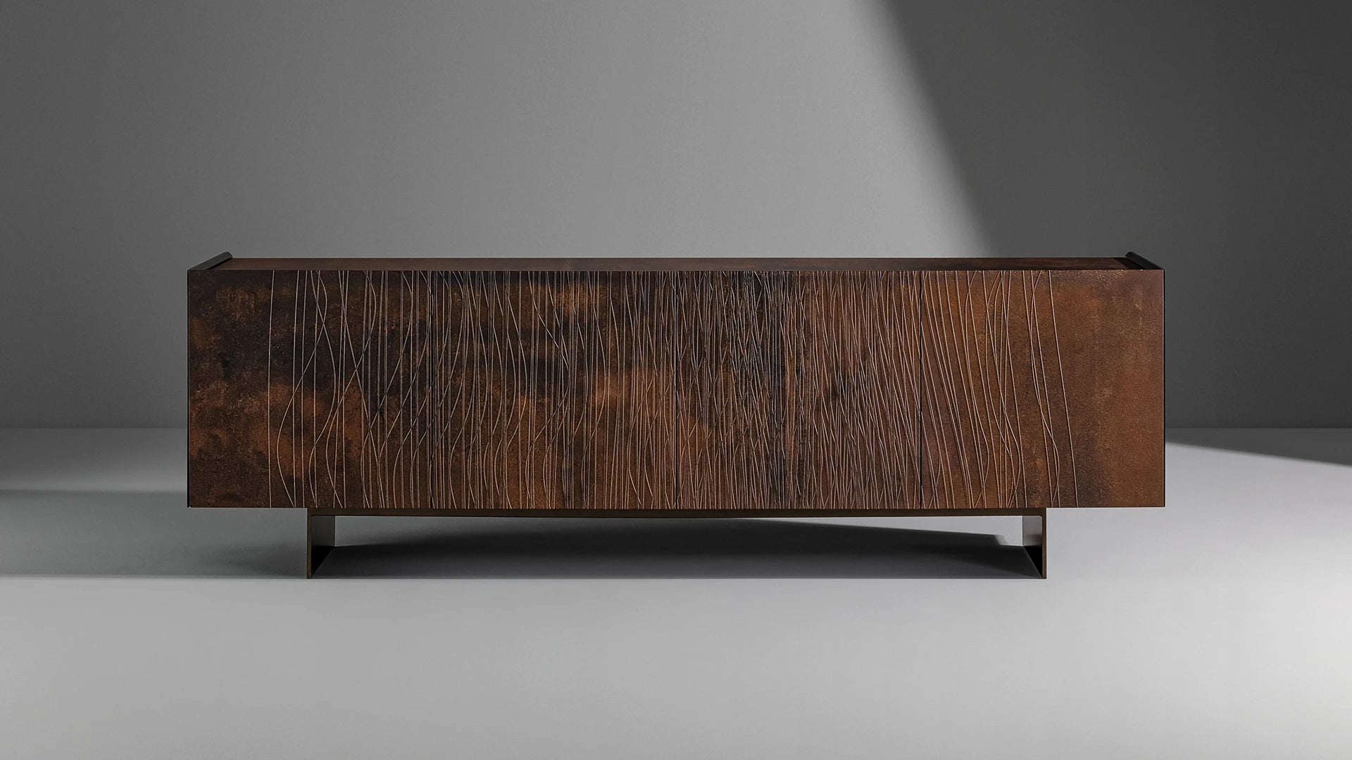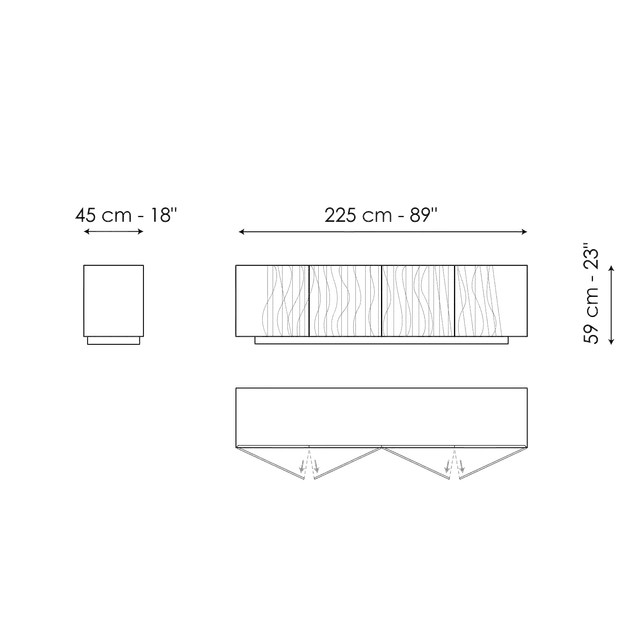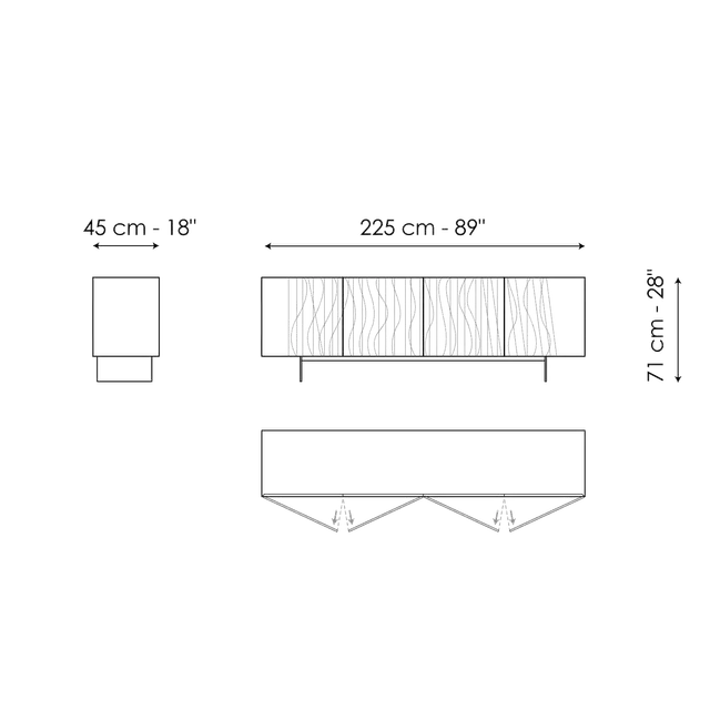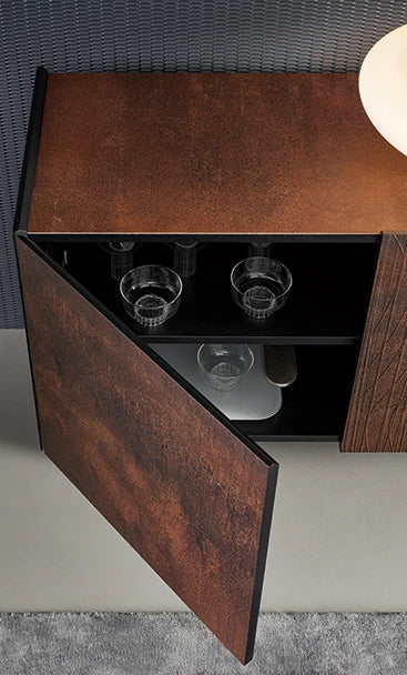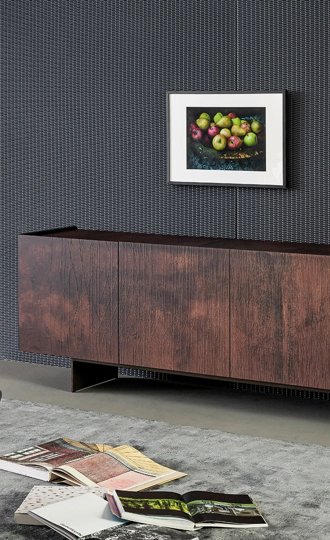 Esențială prin forma și aspectul său, accentuate de designul bazei cu lame duble, bufetul modern din lemn Blush surprinde privitorii datorită stilului secțiunii frontale, marcată de urme brazdate în ușor relief, care dau impresia de „vibrație”. Liniile drepte și curbe ale modelului abstract, care se succed într-un ritm variabil, oglindesc și în același timp subliniază fibra naturală a lemnului, sporind diferitele nuanțe tonale și profunzimile clarobscurului într-un „truc” perceptiv dezvăluit de numele accesoriului : această decorațiune estetică subtilă face ca bufetul să apară într-o culoare roșu închis.