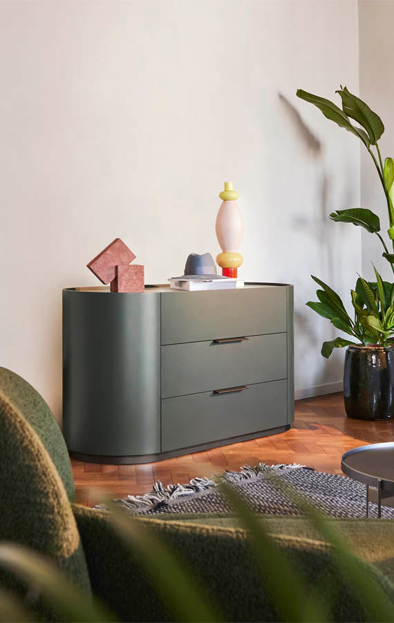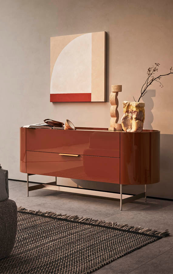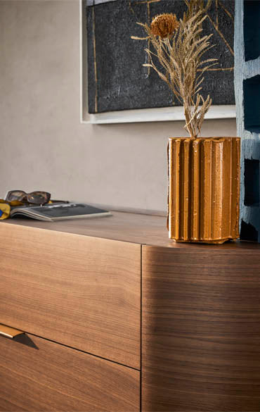Comoda Dedalo cu Canaletto structura, fata si blat, titan mat bază, mâner din piele Hermes. Comoda cu Bosco mat structura si fronturi lacuite cu Blat Farinella terrazzo, plinta din titan mat, mâner din piele neagră.