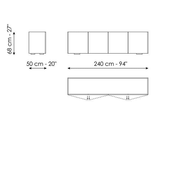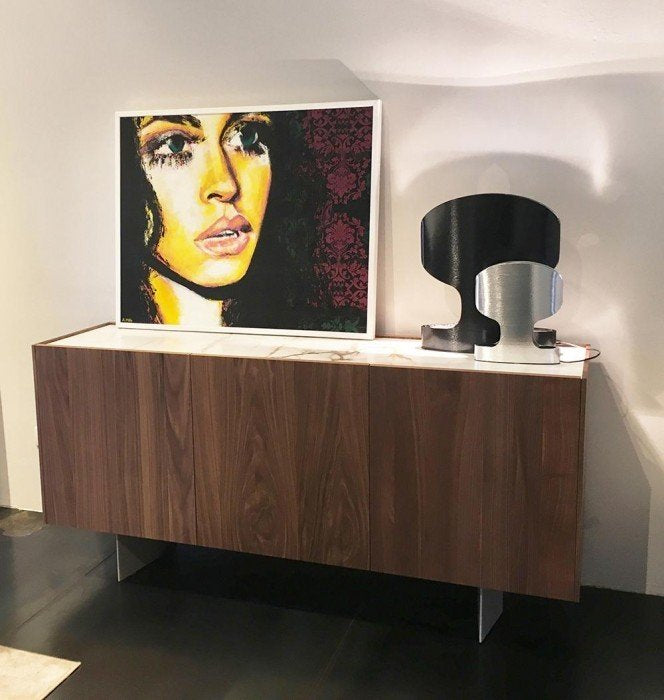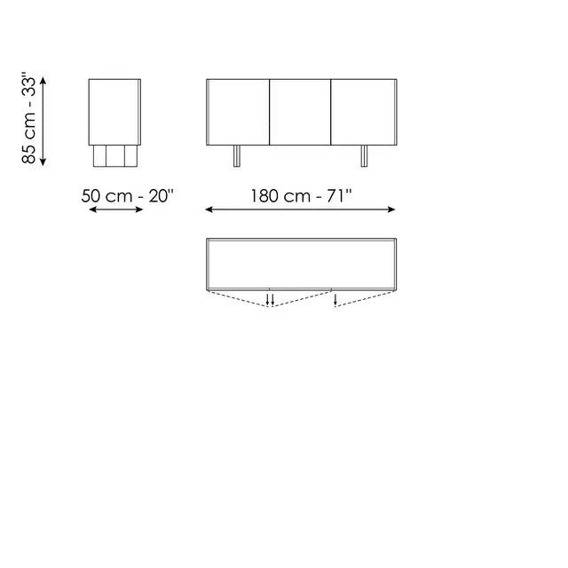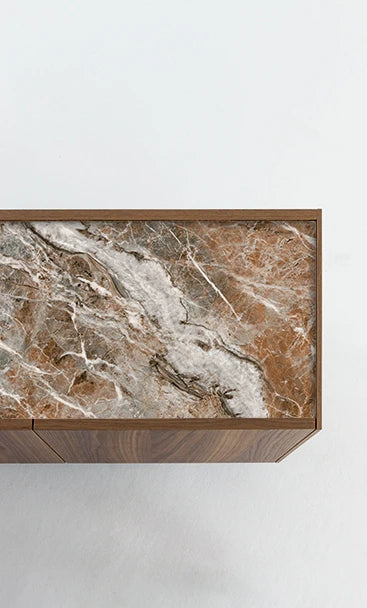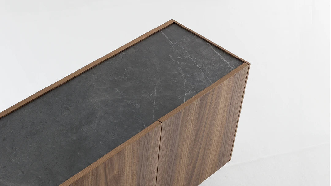 Caracteristica distinctivă a bufetului Outline pentru living este lemnul, mai precis finisajul cald din nuc canaletto folosit pentru întreaga ramă. Blatul, ușor încastrat pentru a sublinia căldura și calitatea lemnului, poate fi realizat din două materiale diferite: nuc canaletto, la fel ca rama, sau ceramică pentru a crea un contrast elegant cu rama din lemn. Baza este disponibilă în două variante: cu picioare joase, pentru cei care preferă siluete minimaliste, sau cu picioare metalice în formă de diamant, pentru cei care preferă obiecte cu o personalitate puternică. Disponibil în versiuni cu trei sau patru uși, Outline se remarcă prin proporțiile generoase și designul rafinat, dar discret, înfrumusețat de alegerea unor materiale valoroase.