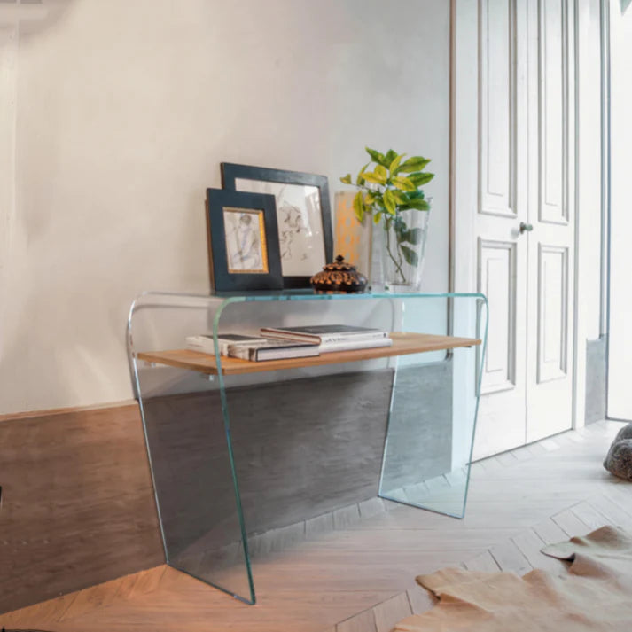Consola Altamura se inspiră din ușurința sticlei și încearcă să o glorifice prin minimalismul formelor sale. Fabricarea complexa a sticlei curbate, duce la un obiect usor, elegant si rafinat. Raftul din lemn sau din sticlă călită a fost gândit să îngroașe și să varieze masa consolei.