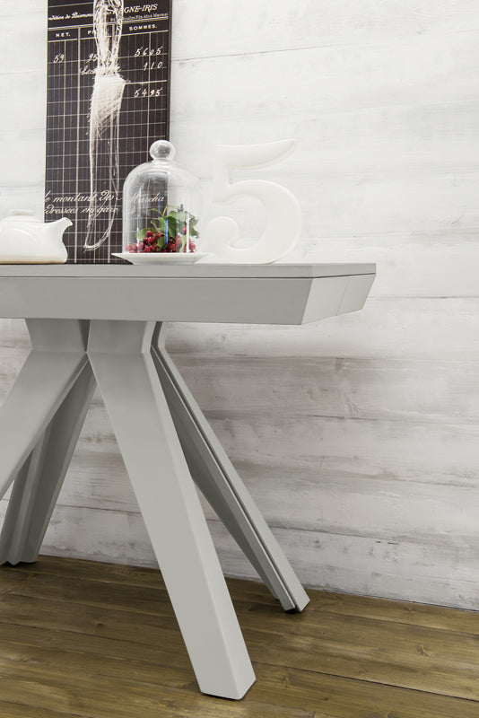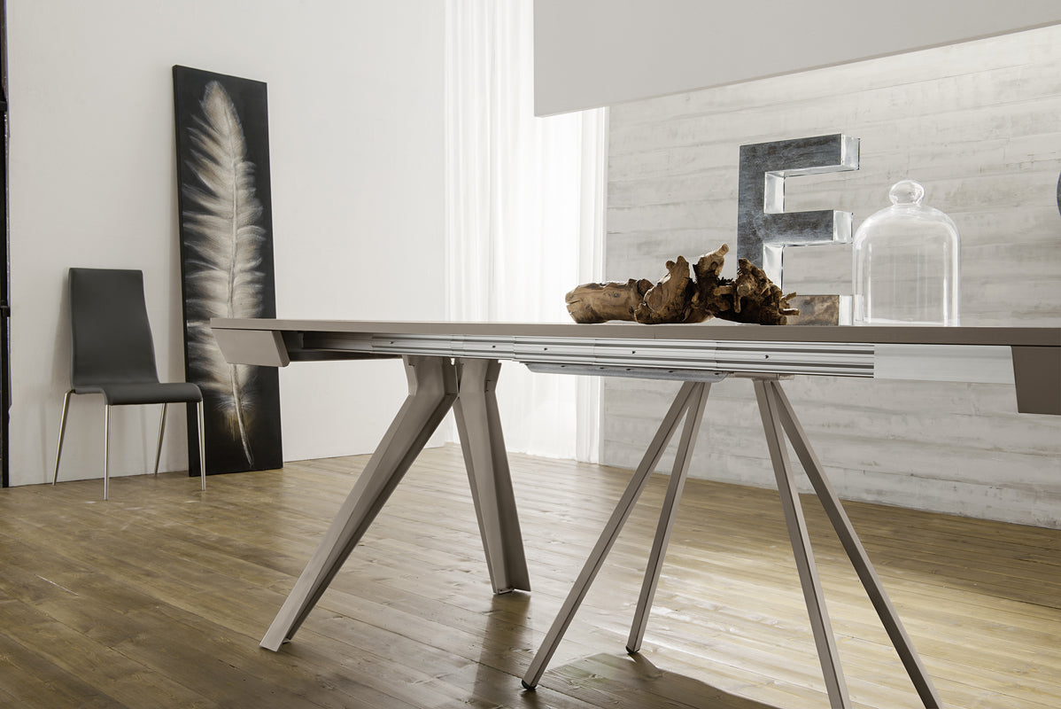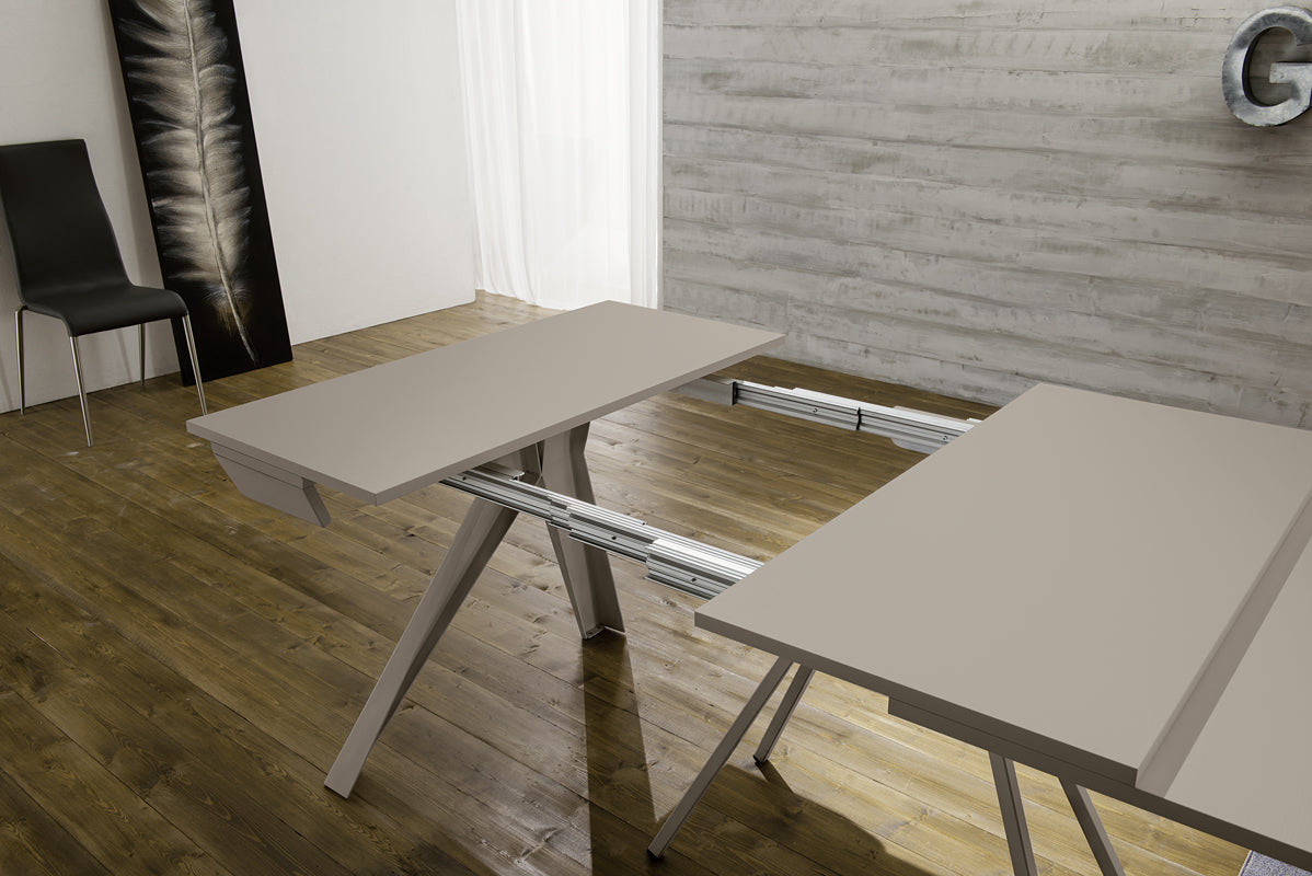 Masa consola extensibila, cu mecanism telescopic din aluminiu, structura metalica vopsita, blat si extensii din melaminat, completata cu geanta extensibila.
