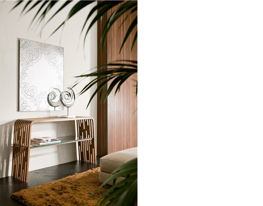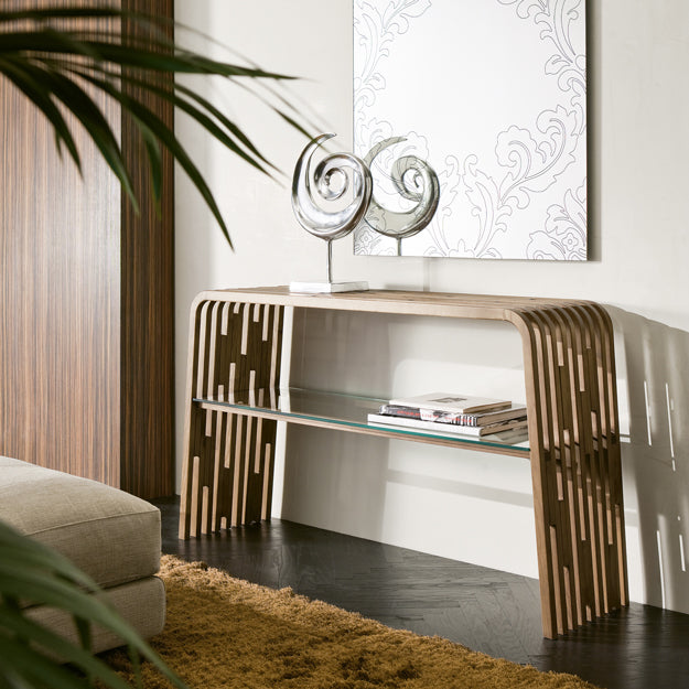 Prelucrarea lemnului masiv din panouri de lemn masiv curbat înfrumusețează spațiile și oferă căldură oricărei încăperi. Consolă din nuc american masiv sau frasin. Raft din sticla naturala.