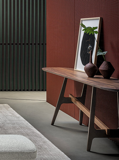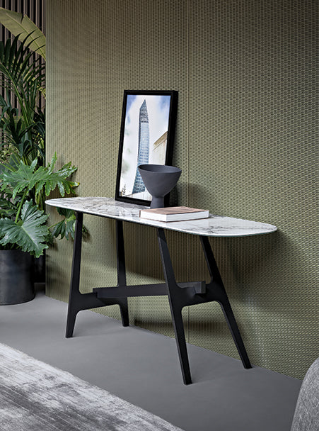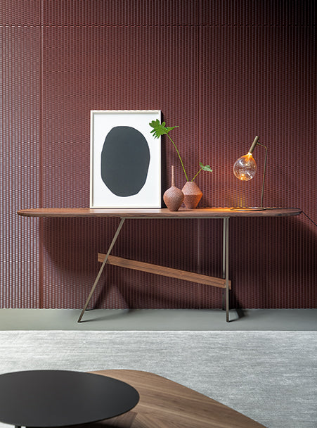 se joacă cu forme minimale articulate în spațiu: blatul orizontal este susținut de două suporturi cu o formă caracteristică H, una verticală și una înclinată, unite printr-un element transversal care transmite o senzație de mișcare. Picioarele si tulpina sunt realizate din metal, in timp ce partea superioara cu colturile rotunjite este disponibil in numeroase finisaje, de la lemn la ceramica, marmura și cristal, creând combinații de materiale care sunt întotdeauna diferite și pot răspunde oricărui mobilier.