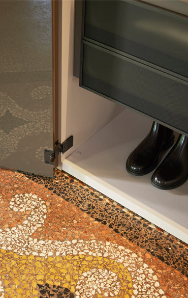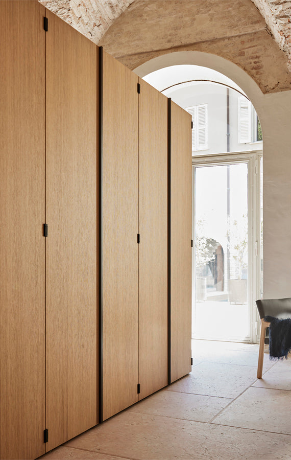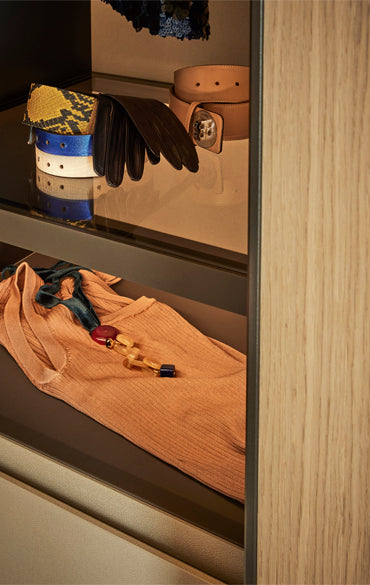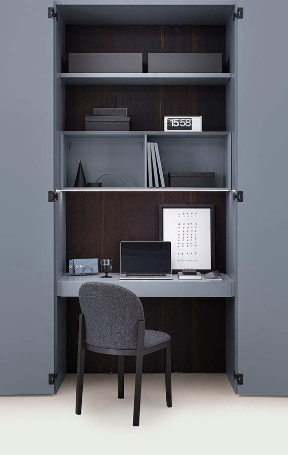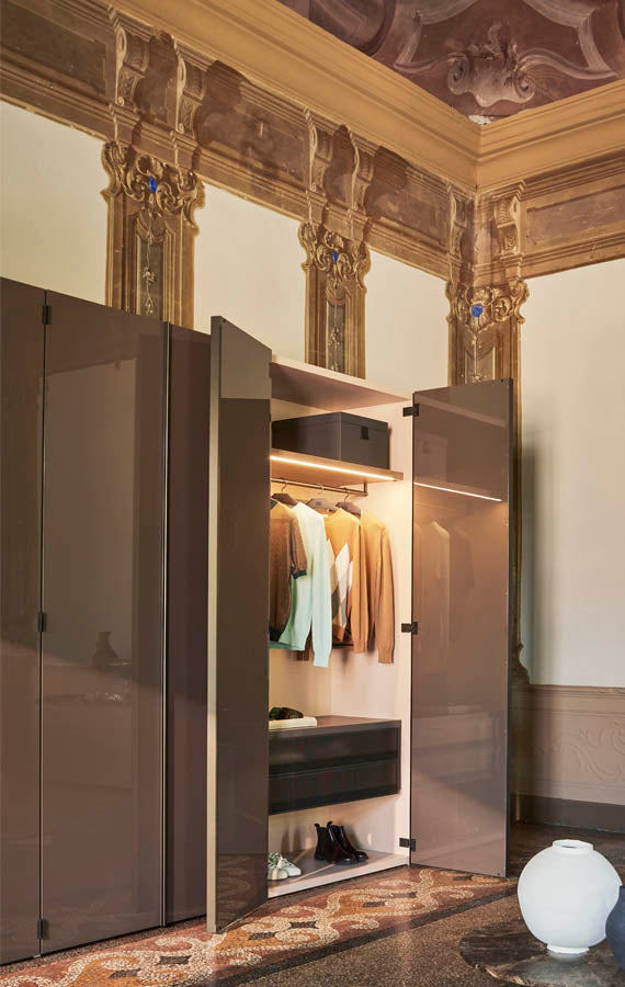 Ca un cufăr de comori, garderoba Amalfi se deschide pentru a-și dezvălui secretele interioare. Nu doar haine și rafturi, ci o nișă de birou la domiciliu pentru o soluție neașteptată și intima pentru spațiu de lucru. Biroul Ala cu sertare, rafturile și modulele deschise creează un spațiu de lucru funcțional, compact, depozitat discret în spatele ușilor care ascund forme și funcții. Detaliile inteligente ale strălucirii din dulapurile, utilizarea inteligentă a luminii ascunse și integrarea celor mai moderne soluții pentru spațiul de birou, fac din Amalfi ajutorul perfect pentru interpretarea fluidității vieții în acest moment, mai degrabă decât un hibrid de genuri diferite. Mânerele ușilor de lungime completă, coordonate sau contrastante cu ușa, îmbunătățesc designul geometric liniar al dulapului. Pe lângă stilurile clasice de deschidere, Amalfi este disponibilă cu o balama specială pentru deschiderea ușii la 180°, amintind de balamalele de pe uși și de mobilierul fin din vremurile trecute.