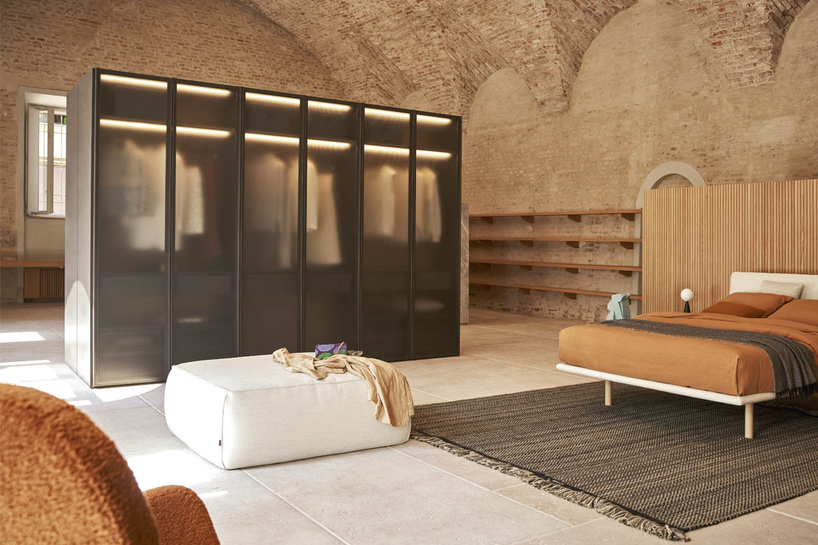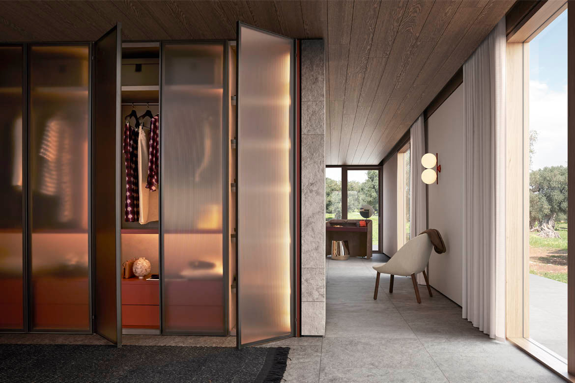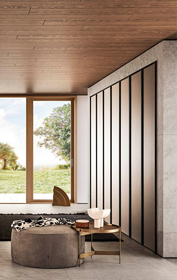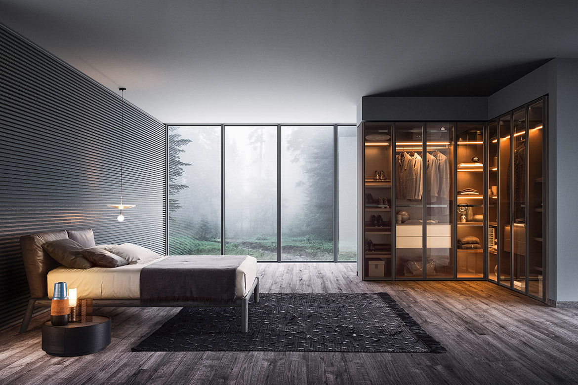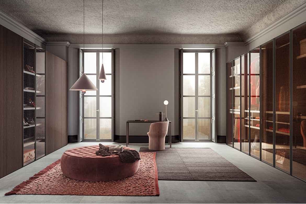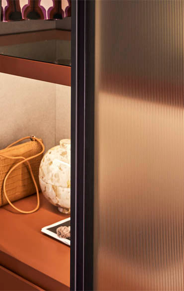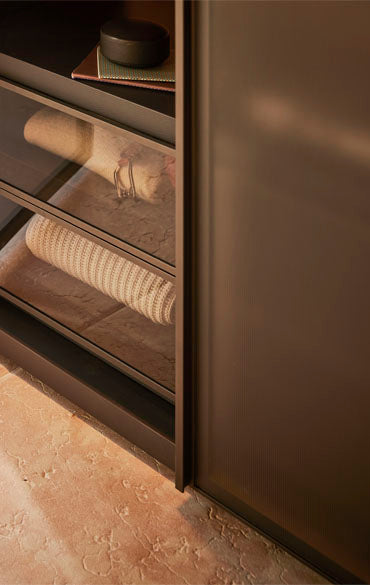 Ca și cum ar fi aranjate într-un butic personal, obiectele și hainele tale trebuie puse în valoare și expuse cu eleganță și ordine. Ușile de sticlă, definite de un cadru Gunmetal Grey sau maro metalizat, pornesc și adaugă o notă de finisare aranjamentelor. Accesoriile interioare vizibile își arată marea capacitate de a organiza eficient spațiile cu stil. Ușile cu balamale sunt prevăzute cu balamale pivotante speciale care se pot deschide la un unghi de 180°.