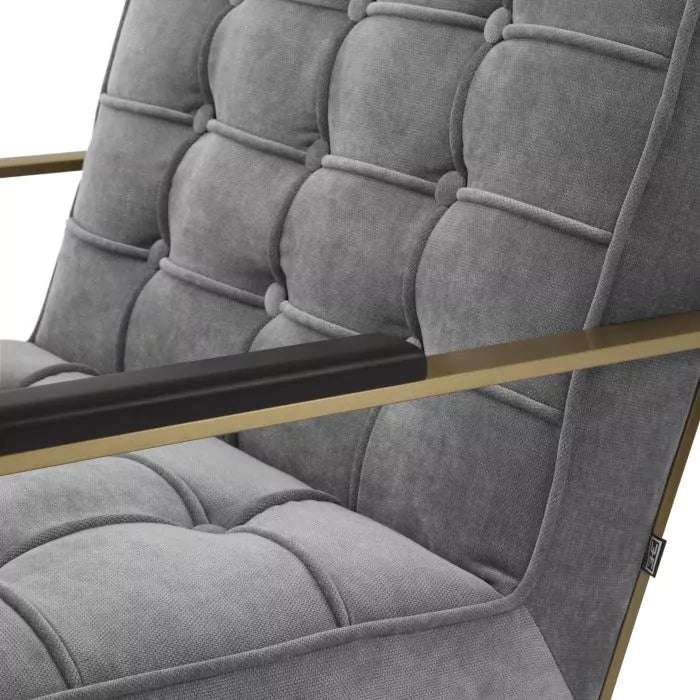 Îmbinând designul contemporan cu stilul înalt, scaunul Ernesto este plin de farmec. Plin de rafinament elegant, acest fotoliu este cu siguranță locul tău preferat din casă. Rama dreptunghiulară are un finisaj din alamă periată. Scaunul și spătarul ultra-căptușit sunt tapițate în gri Clarck și împodobite cu smocuri de biscuiți.