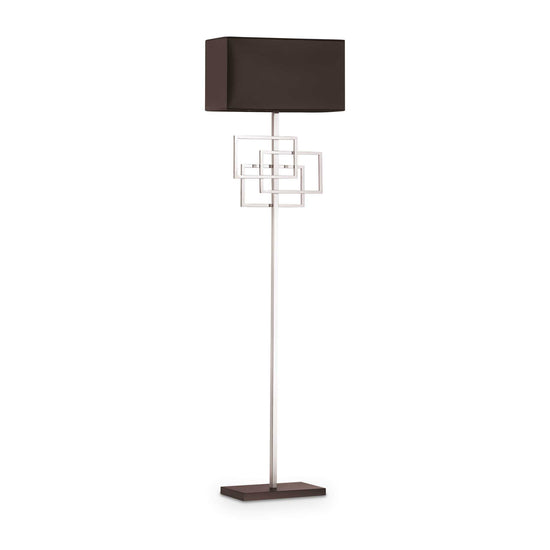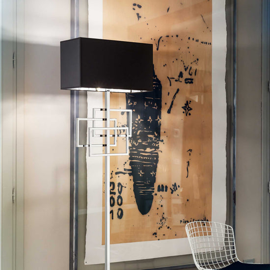 Cadru metalic finisat in alama sau crom. Baza neagra mata. Abajur din PVC cu margini din material textil.