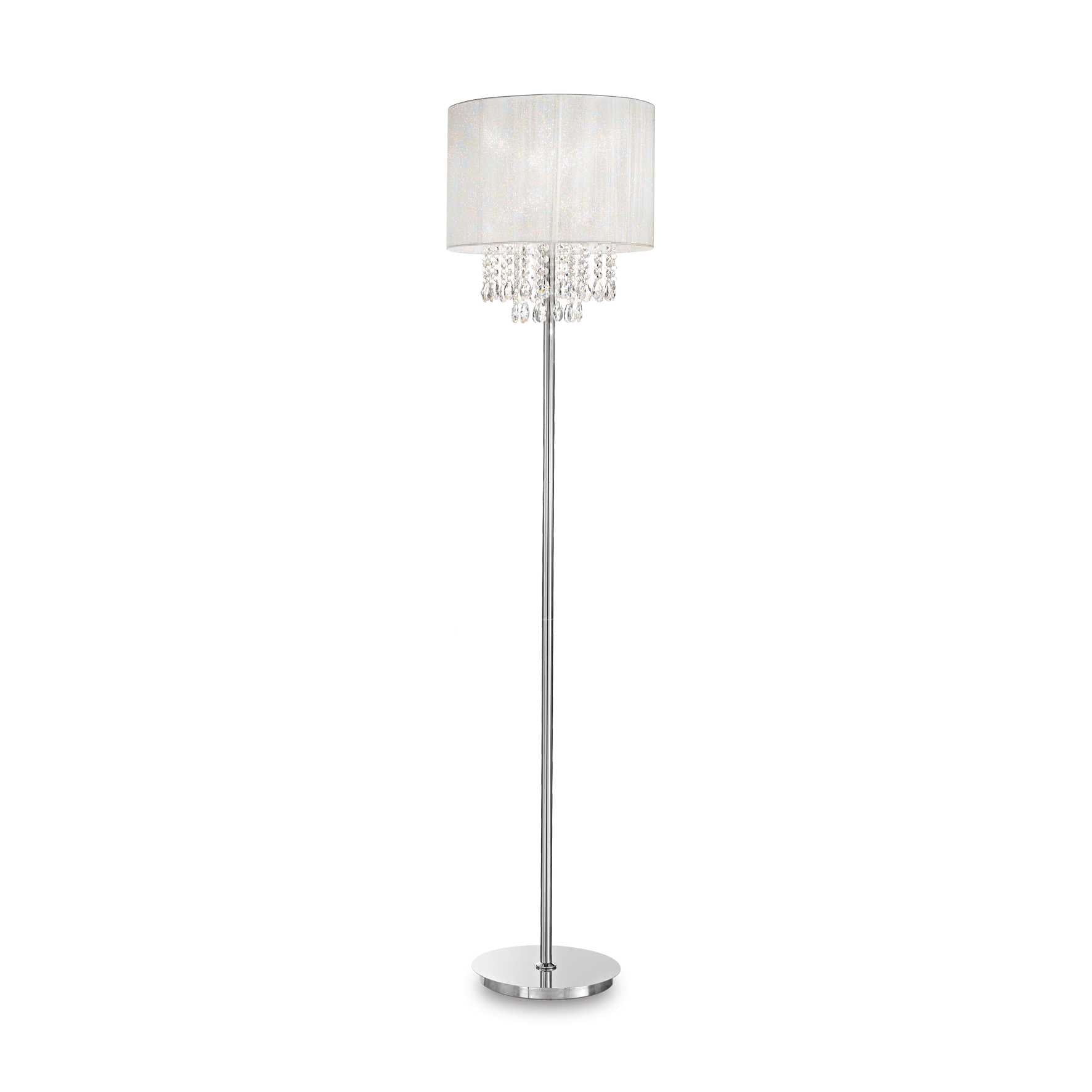 Cadru cromat. Abajur din folie PVC cu reflexii metalice si acoperit cu fire. Pandantive din cristal tăiat.