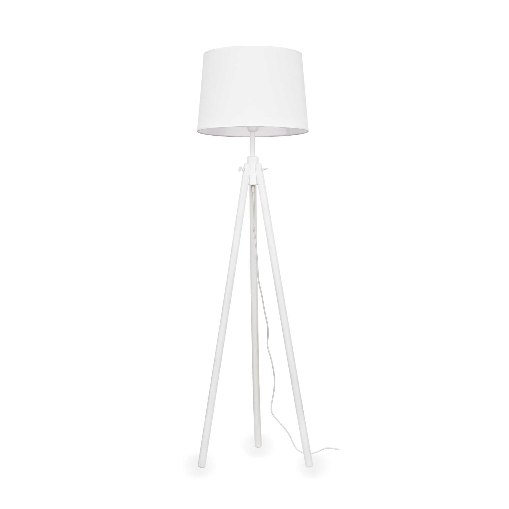 Baza din lemn natural cu detalii metalice. Abajur din folie pvc imbracata in stofa. Cablu extern din material textil. Disponibil și cu cadru și abajur alb sau negru.