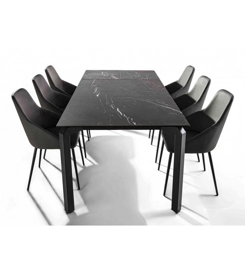Masa extensibila Atlante de la La Seggiola cu structura din otel vopsit negru si blat din sticla ceramica (grosime 3 mm ceramica + sticla 10 mm) finisaj piatra neagra soft touch. De o manopera excelenta, se caracterizeaza prin blatul din sticla ceramica eleganta si rafinata, un material foarte practic si functional deoarece este rezistent la taieturi, incizii, temperaturi ridicate (oale fierbinti, fier etc...).