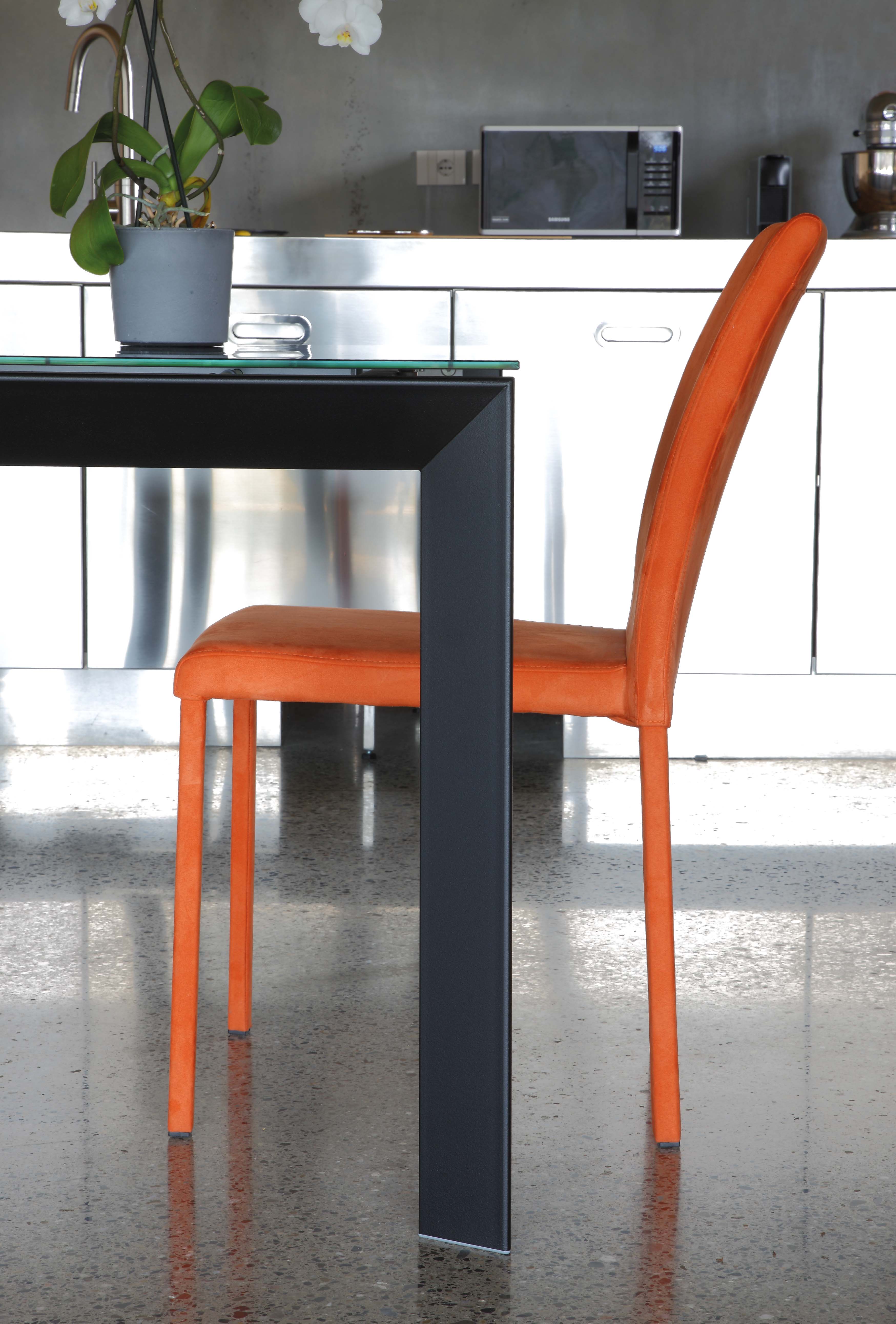 Masa de dining extensibila model Dinner cu blat de sticla securizata vopsita si structura metalica vopsita in aceeasi culoare cu blatul.