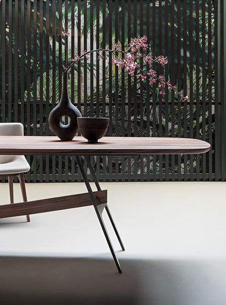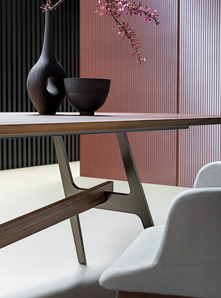 Slot întruchipează cercetarea formală și tehnologică extinsă care a stat la baza produselor Bonaldo. Pentru asta, designerul Giuseppe Viganò se inspiră din lumea geometriei, din care împrumută diferite forme și le armonizează într-un singur design. Colecția se joacă cu forme minimale articulate în spațiu: vârful orizontal este susținut de două suporturi cu formă caracteristică H, unul verticală şi unul înclinat, unite printr-un element transversal care transmite o senzație de mișcare. Picioarele și tulpina centrală sunt realizate din metal, în timp ce partea superioară cu colțuri rotunjite este disponibil in numeroase finisaje, de la lemn la ceramica, marmura și cristal, creând combinații de materiale care sunt întotdeauna