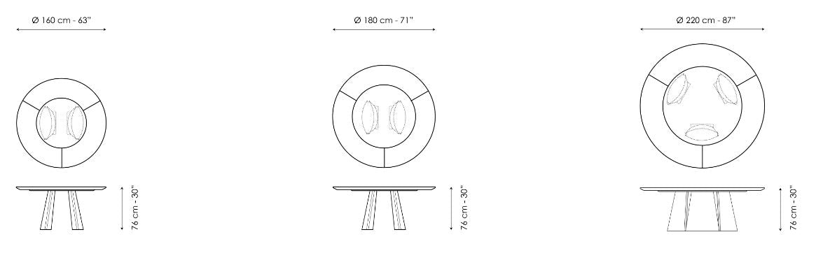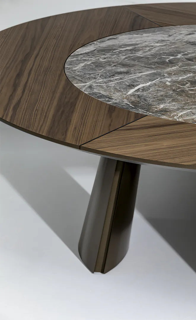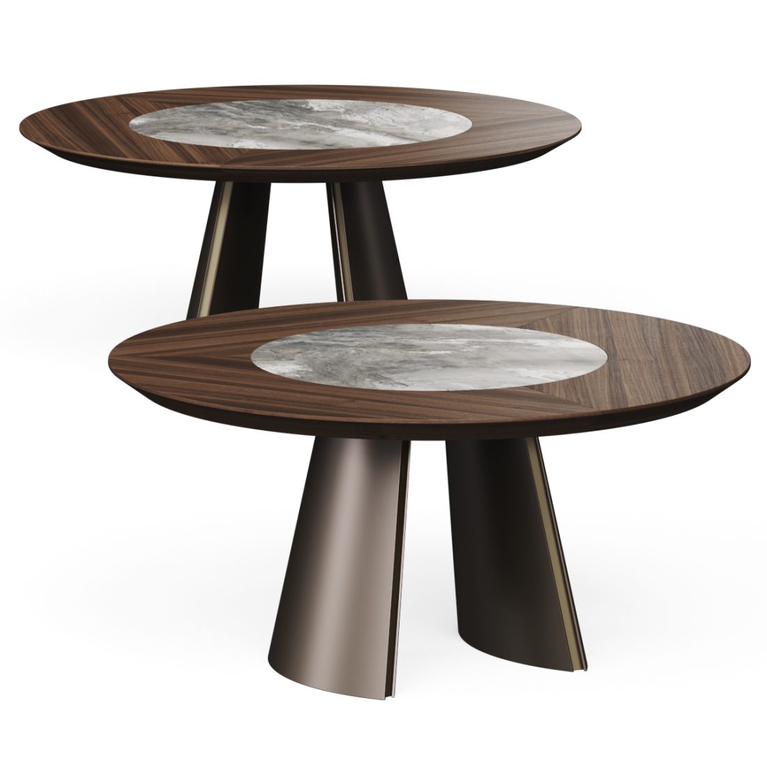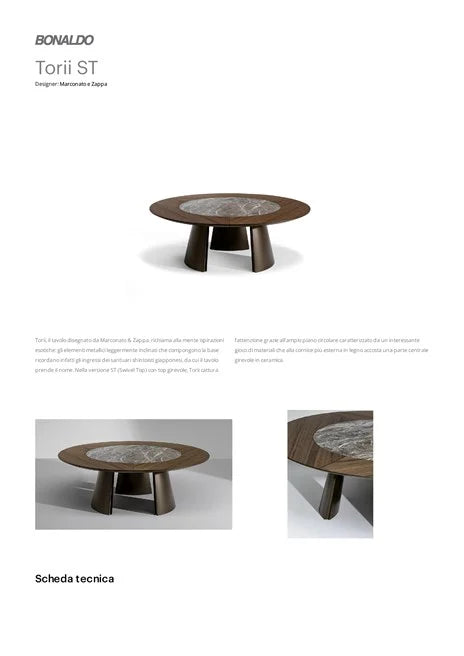 Masa Torii proiectată de Marconato & Zappa își demonstrează clar inspirația exotică: elementele metalice ușor înclinate care alcătuiesc baza amintesc de intrările în altarele shinto japoneze, de unde își ia numele această masă rotundă din lemn. Versiunea Torii ST (Swivel Top) cu blat rotativ atrage atenția datorită suprafeței circulare mari, care prezintă o interacțiune interesantă între materiale și care combină cadrul exterior din lemn cu o secțiune centrală ceramică rotativă. Rezultatul este un contrast de materiale și finisaje pentru o masă cu o prezență teatrală semnificativă.