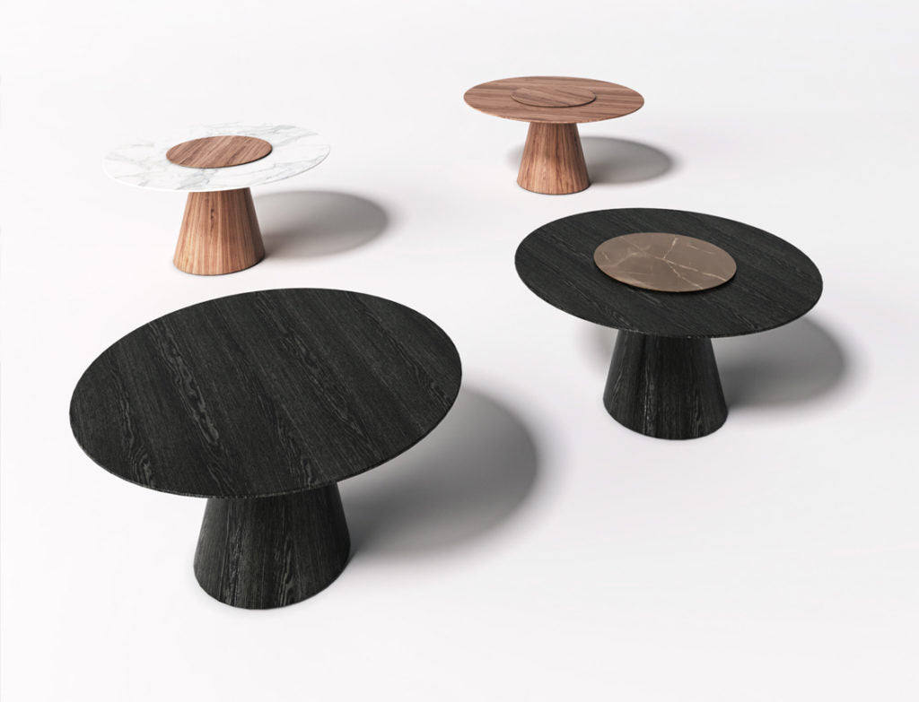 Masa Pisa se caracterizeaza printr-un picior tronconic tapitat cu lemn si vopsit in finisajele disponibile. Un blat circular în finisajele disponibile este fixat de piciorul central. O trăsătură caracteristică a mesei este blatul opțional pivotant, acționat cu un finisaj independent față de blatul fix, astfel încât să asigure un joc de culori și combinații de finisaje diferite.