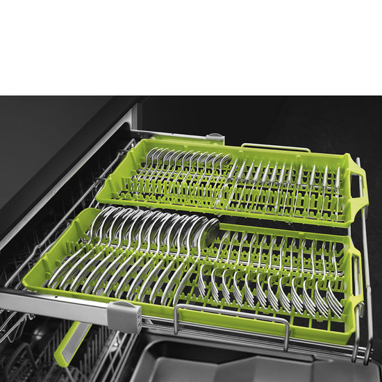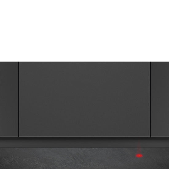 Orbital wash system distributes water evenly throughout the 60cm dishwasher cavity, directing water with precision to ensure an excellent wash. The Aquatest sensor is an electronic sensor that measures the degree of water transparency at the end of the initial soaking phase. ased on the values measured, the sensor sets the most suitable programme, thus obtaining the best washing results with the minimum amount of water. Activelight is an led light which projects a red spot onto the floor beneath the dishwasher when the appliance is in use. Total Acquastop: In addition to the partial Acquastop protection present in all Smeg dishwashers, some models have an electronic device fitted to the water intake hose, which monitors water levels in the machine, detects leaks in the hose and switches off the water supply immediately when necessary. The work aimed at continuous improvement has allowed the creation of the second generation of the Inverter motor 2.0, characterised by greater efficiency and durability over time,
