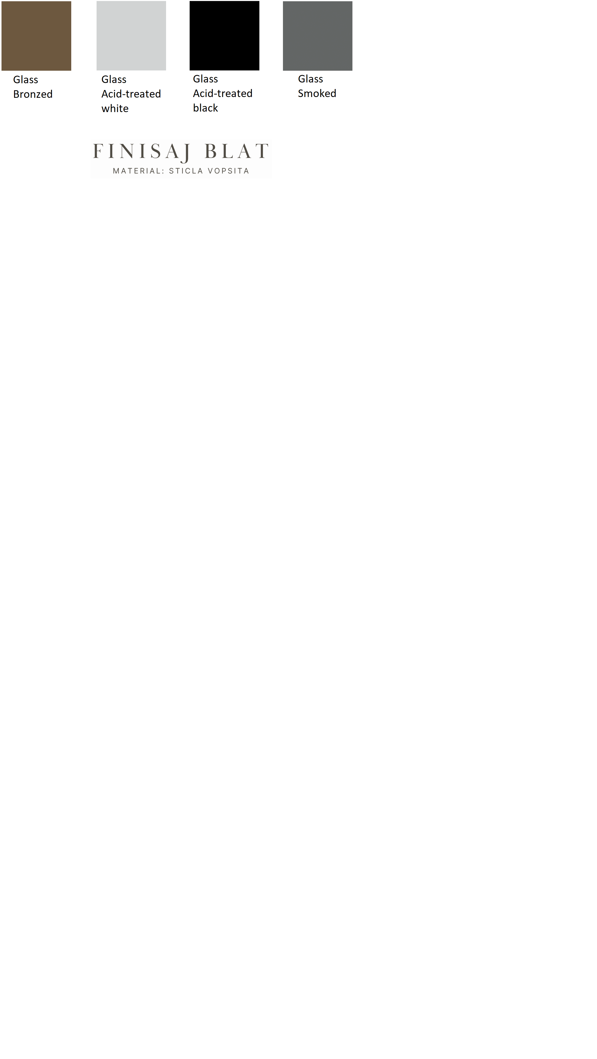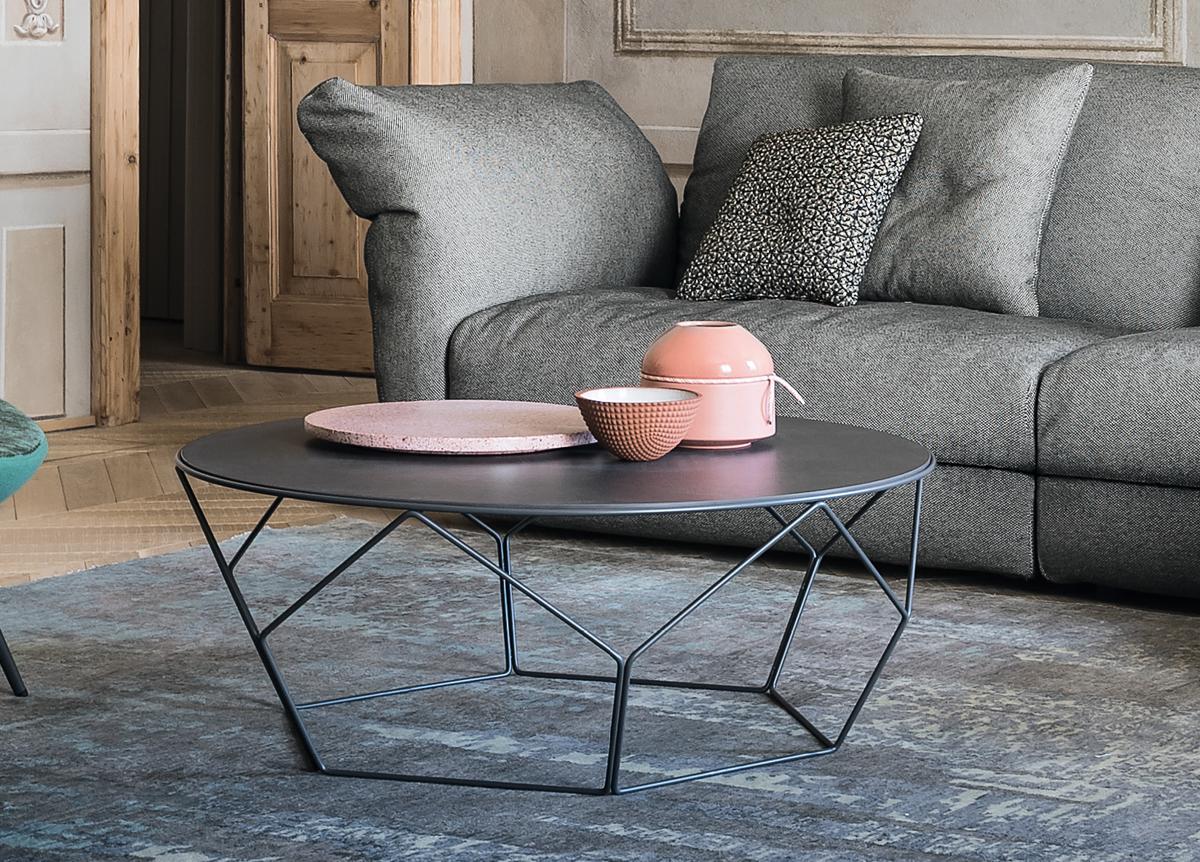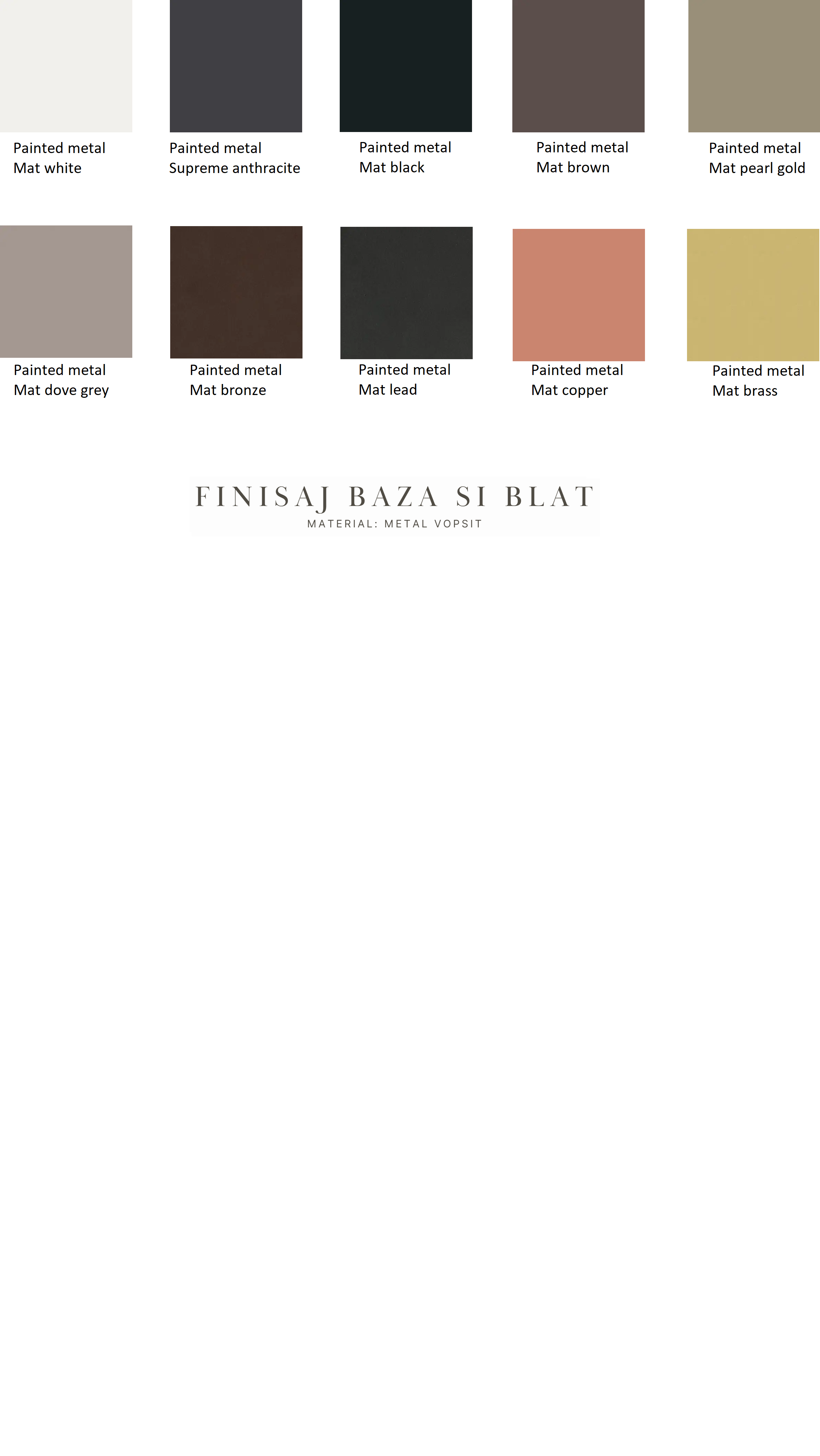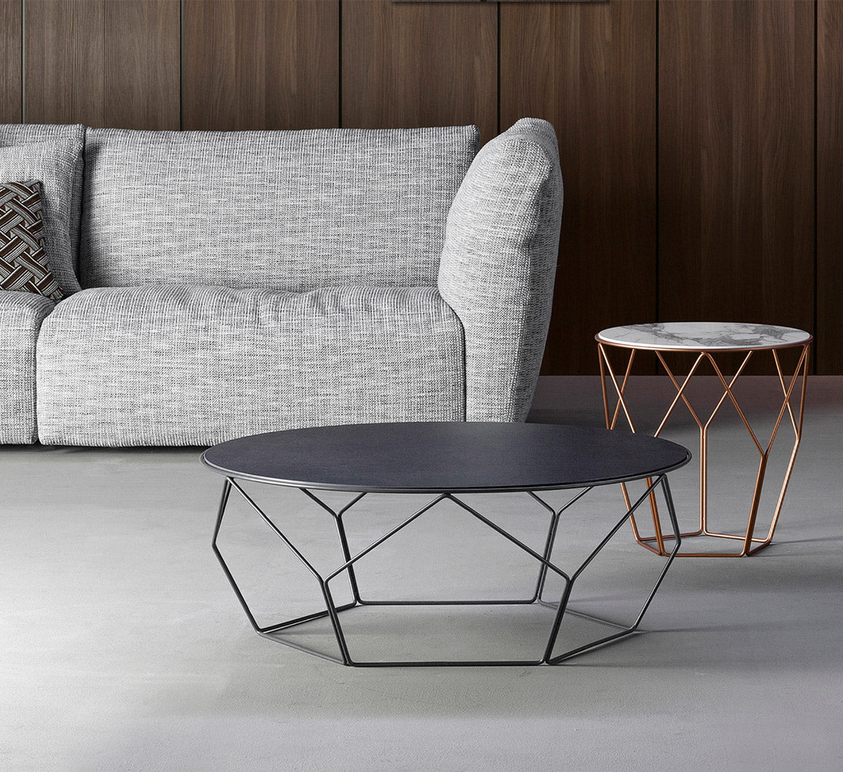 Baza din tije curbate de otel, cu o mare valoare decorativa, care susțin un blat subțire, dar prețios, realizat în același finisaj ca și baza, sau în diverse tipuri de sticlă sau ceramică. Baza este disponibilă în finisaje multiple si poate fi completat cu un metal vopsit de jos, care servește ca suport practic pentru reviste sau tavă pentru obiecte.