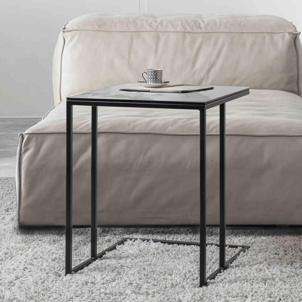 Masuta de cafea cu design modern, minimalist. Blatul este din ceramica si imita marmura alba, iar suportul este metalic vopsit mat.
