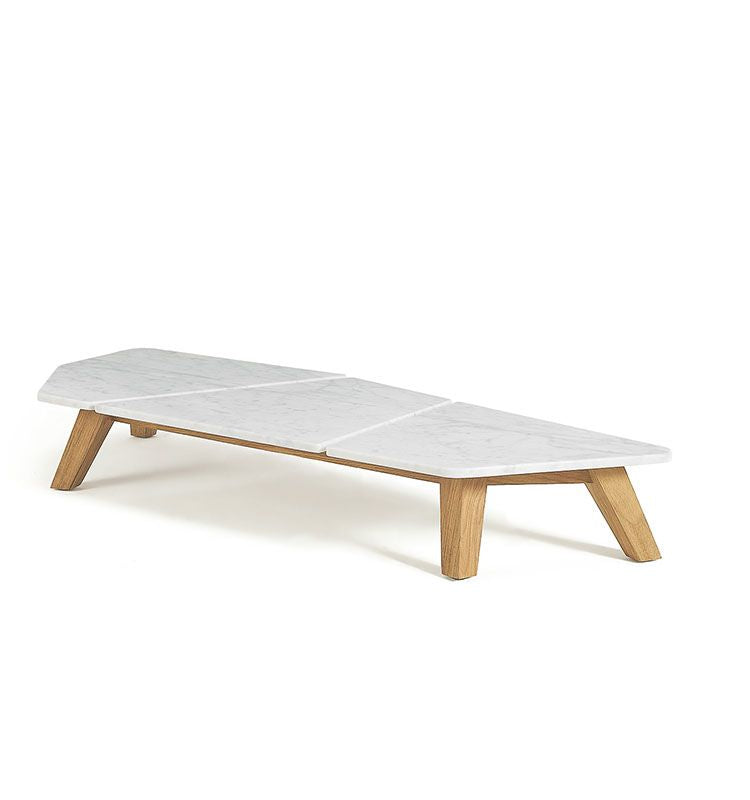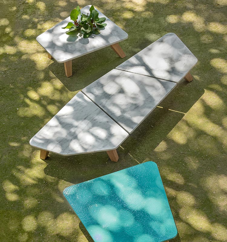 Rafael este o colecție cu un aspect neobișnuit și un caracter puternic, influențată de versatilitatea și efemeritatea naturii. Structura robustă din tec periat, cu capse metalice care adaugă o notă de măiestrie, se întâlnește cu texturile și nuanțele pernelor, într-un dialog compozițional în care se inserează mesele din marmură albă sau piatră glazurată în culoarea mării. Lucrările artizanale ale lemnului de tec, marmură și piatră de lavă se combină de fapt cu gama sofisticată de culori textile, din nou proiectate de Paola Navone, care îmbunătățesc mobilierul căptușit.