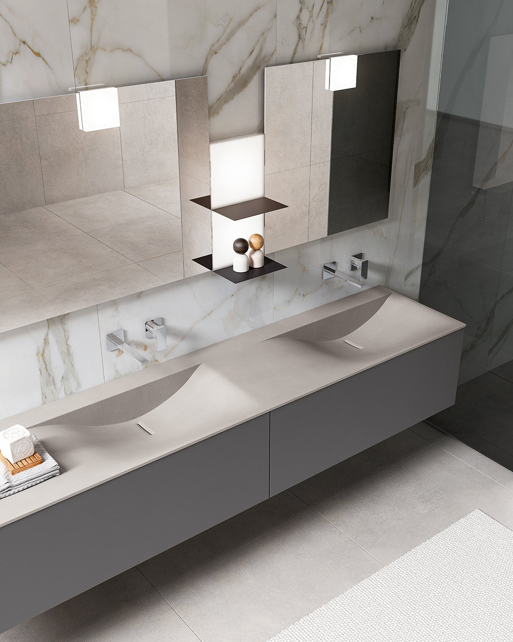 Abilitățile de croitorie ale BMT sunt exprimate în acest proiect, caracterizat prin finisajele rafinate și chiuveta fin sculptată. O atenție extraordinară la alegerea materialelor, proceselor de prelucrare și sistemelor de producție. Un stil contemporan rafinat, cu accent pe ergonomie și funcționalitate. Un proces de design care nu-și trădează matricea artizanală. Liniile curate sunt sporite de absența mânerului: de fapt, toate ușile și sertarele sunt echipate cu un mecanism de deschidere push-pull.