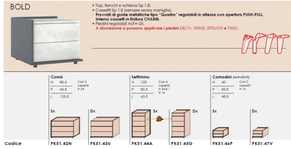 Grupul BOLD este disponibil în diferite finisaje de lemn sau clori lăcuite, profilul interior al sertarelor este în finisaj Charm, cu posibilitatea de a alege între diverse mânere disponibile.